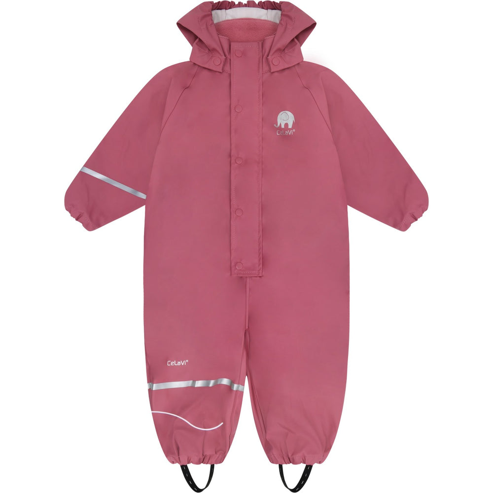 Gør regnvejrsdage sjove med CeLaVi Rose Wine Regntøj Dragt i solid PU. Dette holdbare, ensfarvede regntøj er designet til optimal beskyttelse med vind- og vandtæt materiale og svejsede samlinger. Vandtrykket er testet til 5000 mm. For komfort og form er der elastiske kanter ved håndled og ankler samt gummistropper nederst på benene. Dragten har også en praktisk lukning med lynlås og presseknapper. Sikkerhedsdetaljer inkluderer reflekterende striber på arm og ben samt en aftagelig hætte. Perfekt til eventyrlystne børn, tilgængelig i flere farver.