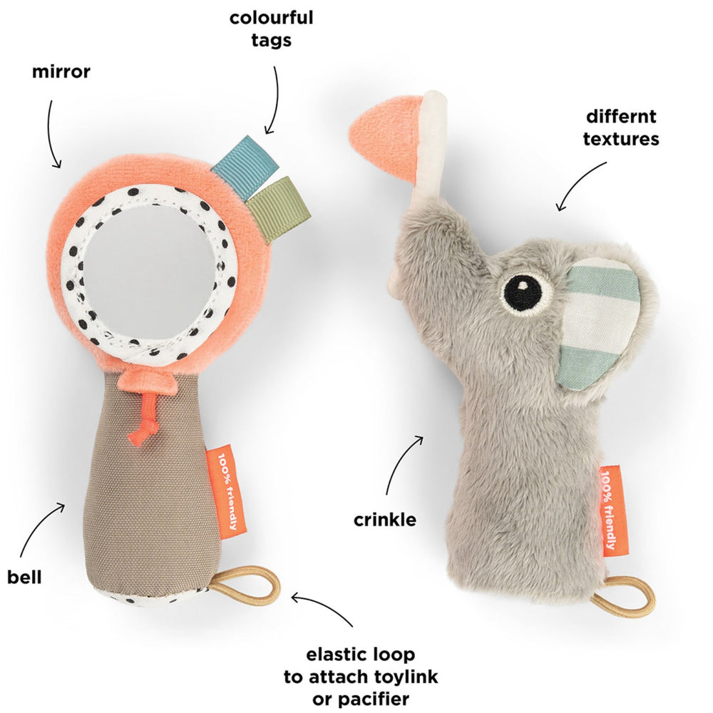- Opmuntrer til sensorisk udforskning gennem krusninger, rangler, spejle og farverige detaljer