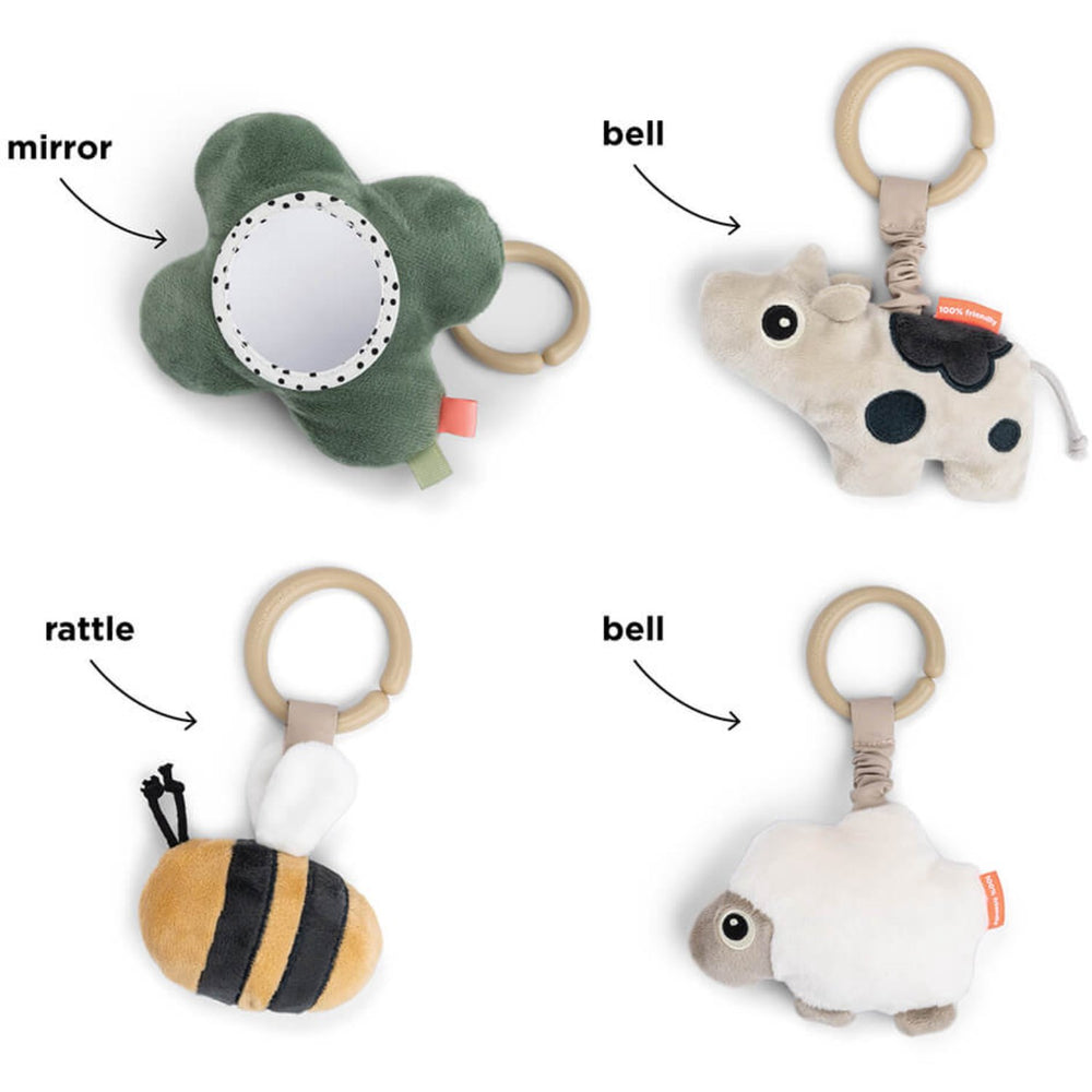 - Ekstra: • Sensoriske elementer som en rangle, en klokke, knitren og et spejl vil stimulere dit barns hørelse og taktile sans • Tilpas de fire hængende stykker legetøj til dit barns udviklingstrin • Tag legetøjet ned og brug individuelt for at give små fingre mulighed for at udforske • Blød, vatteret legemåtte med søde skyer i tyk polstring • Søde pudderfarver og sjove kontrastfarver for visuel stimulering • Lad de Deer friends underholde din baby, når det er legetid