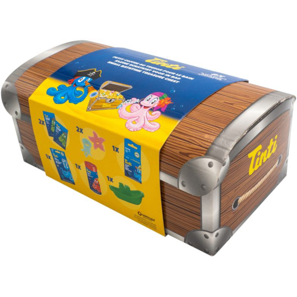 Forkæl dit barn med Tinti Skattekiste, der indeholder otte spændende dele til badetiden. Dette sæt byder på sjove og sikre badelegetøjer, som er dermatologisk testet for at sikre dit barns velvære. Med alt fra badesvampe og knitrebad til farverige badekrystaller og sprudlende badebomber, sørger denne skattekiste for underholdende og fantasifulde badeoplevelser. Perfekt til små eventyrere fra tre år og op, der elsker at udforske og lege under hvert bad.