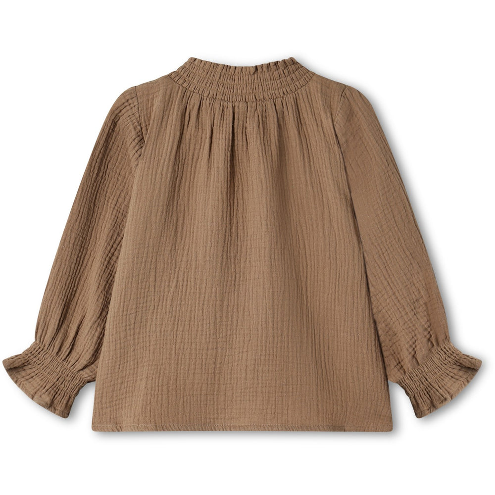 Denne charmerende bluse fra Fliink Pine Bark er fremstillet i 100% blød bomuldsmusselin, der sikrer både komfort og holdbarhed. Designet med elastik både i nakken og ved de lange ærmers afslutning, tilføjer elegante flæser som en fin detalje. Den løstsiddende pasform gør blusen ideel til børns legeaktiviteter, samtidig med at den bevarer et stilfuldt udseende. Velegnet til maskinvask på 30°C i skåneprogram.
