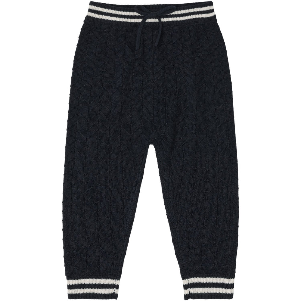 Disse komfortable og stilfulde FUB Dark Navy Baby ZigZag Bukser er fremstillet af 100% OEKOTEX-, RWS- og BLUESIGN-certificeret merinould. Designet med en afslappet pasform og lavt skridt sikrer optimal bevægelsesfrihed til dit barn. Bukserne fremhæver en unik zigzag-struktur, en elastisk linning med dekorativ snorebue og praktiske ribmanchetter. Det allergivenlige og miljøvenligt behandlede garn tillader maskinvask, hvilket gør disse bukser ideelle til daglig brug.