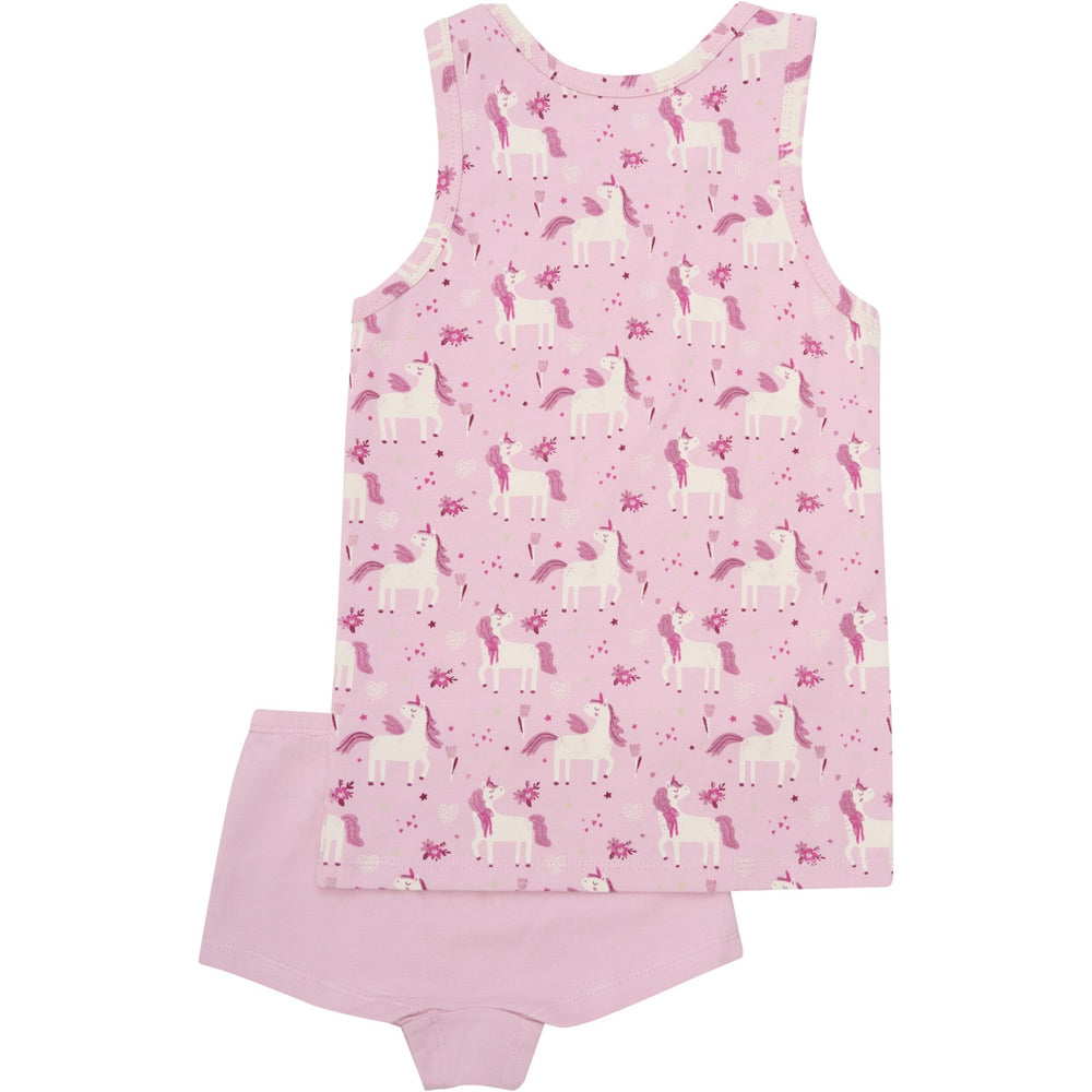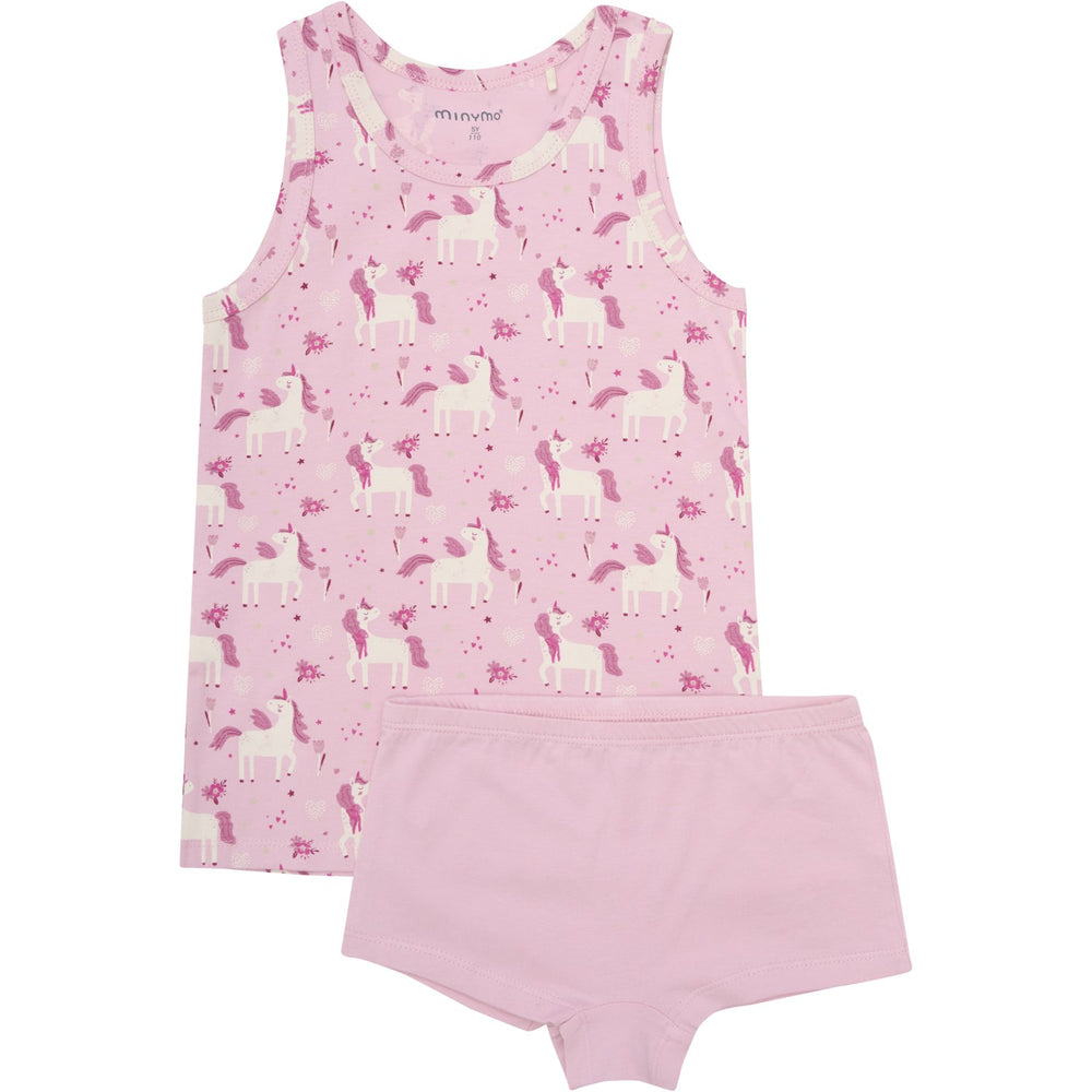 Dette Minymo Bleached Mauve undertøjssæt er perfekt til dit barns garderobe. Sættet omfatter en undertrøje med brede stropper og charmende enhjørningeprint, samt matchende ensfarvede underbukser. Begge dele er fremstillet i økologisk bomuld, certificeret efter GOTS (CERES-0366), hvilket sikrer en blød og behagelig oplevelse for dit barn.