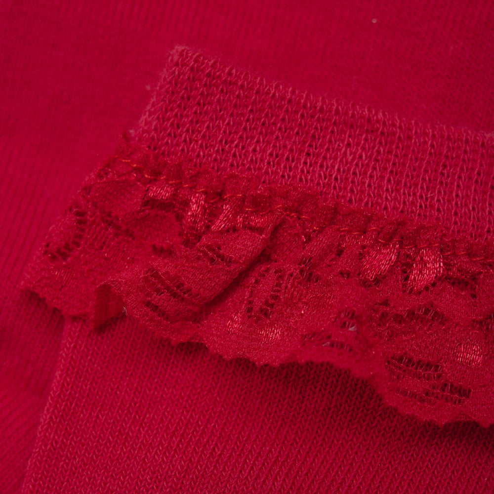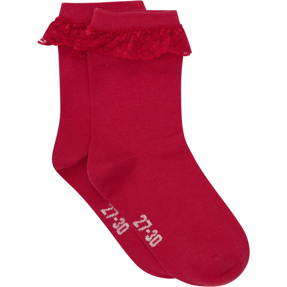 Disse Minymo røde ankelstrømper er prydet med en elegant bomuldsflæse øverst, hvilket tilfører et festligt touch til både hverdags- og festtøj. Strømperne er fremstillet i materialet, der er certificeret i henhold til STANDARD 100 by OEKO-TEX® (cert. nr. 15.HTR.58706 HOHENSTEIN HTTI), hvilket sikrer både sikkerhed og komfort for dit barns hud.
