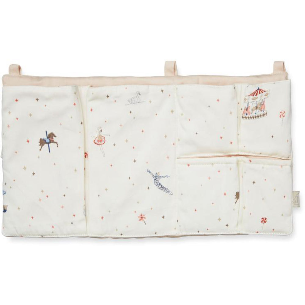 Giv dit barns seng en funktionel opgradering med Cam Cam Copenhagen Carousel Sengelomme. Denne smarte sengelomme, designet i bløde hvide og brune nuancer, holder orden i småting som sutter og nusseklude. Perfekt placeret på tremmesengen for nem og hurtig adgang. Sengelommen øger både komforten for dit barn og gør nattetid mere overskuelig for dig som forælder, hvilket bidrager til roligere nætter for hele familien.