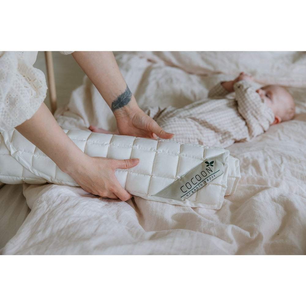 Cocoon Kapok Rullemadras til Babybay-sengen tilbyder naturlig komfort og hygiejniske fordele til dit barns sovemiljø. Dette madrasunderlag er fyldt med blødt kapok, kendt for sine varmeregulerende og fugttransporterende egenskaber, hvilket sikrer en tør og behagelig søvn for dit barn hele natten. Kapokfibren er også naturligt allergivenlig, hvilket minimerer risikoen for irritation og allergi, gør det til et ideelt valg for sensitiv hud. Let at vedligeholde og hurtig at tørre, passer denne kapok rullemadras perfekt i Babybay-senge, hvilket gør den både praktisk og essentiel for en god nats søvn.