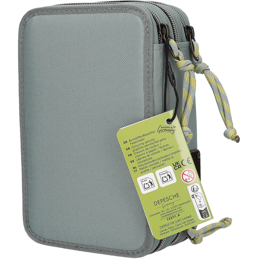 Gør skolestarten spændende med Dino World Bite Triple Penalhus. Det robuste, grågrønne design med dynamisk dinosaurmotiv appellerer til ethvert barns fantasi. Tre rummelige rum holder skriveartiklerne organiseret: 18 farve- og tuschpenne, to blyanter, samt nødvendigt tilbehør som spidser, viskelæder, lineal, saks og limstift. Penalhuset er fremstillet i 100 procent PES, hvilket sikrer lang holdbarhed. De farvekoordinerede snørebånd på lynlåsene gør det nemt for små hænder at åbne og lukke penalhuset.