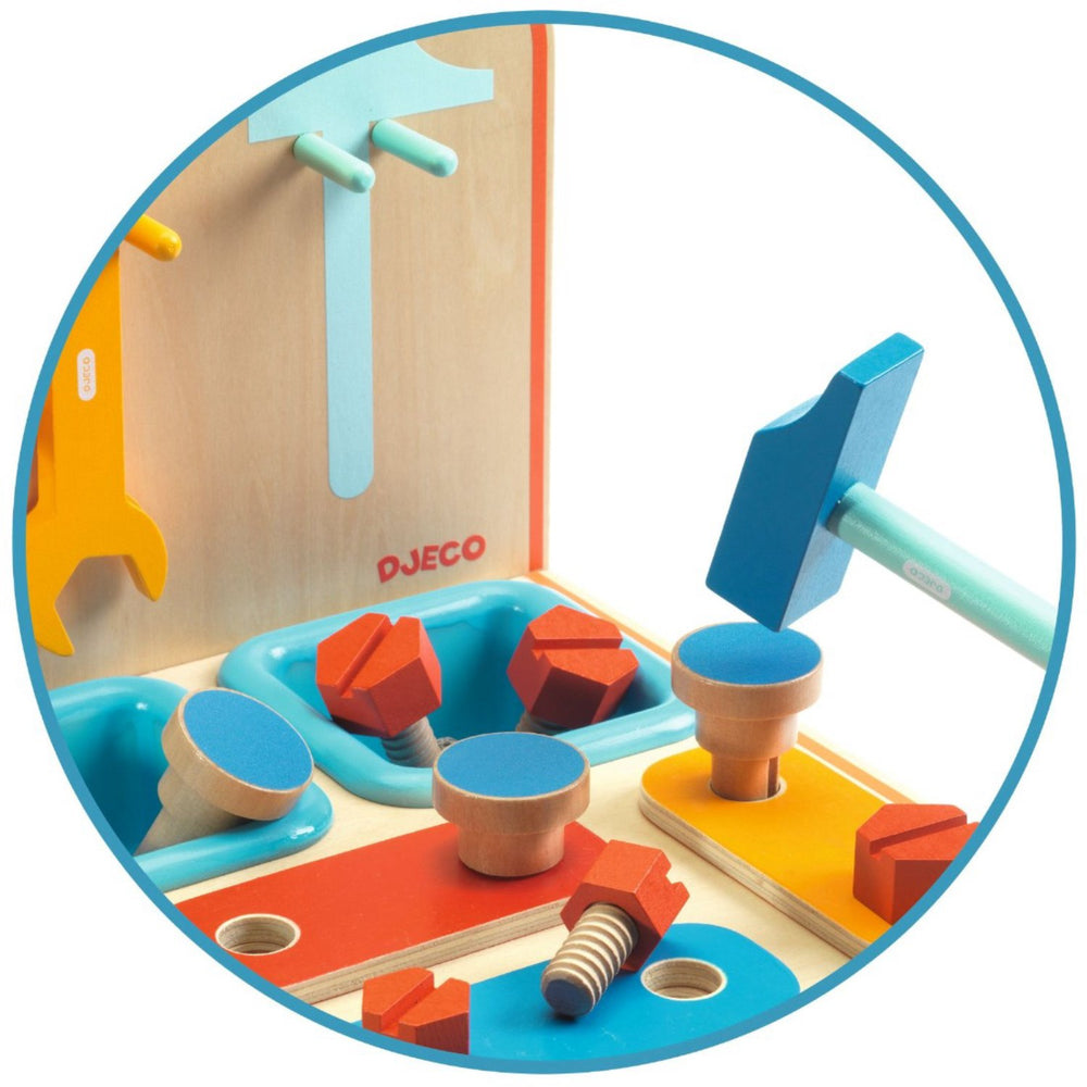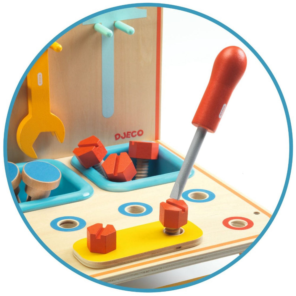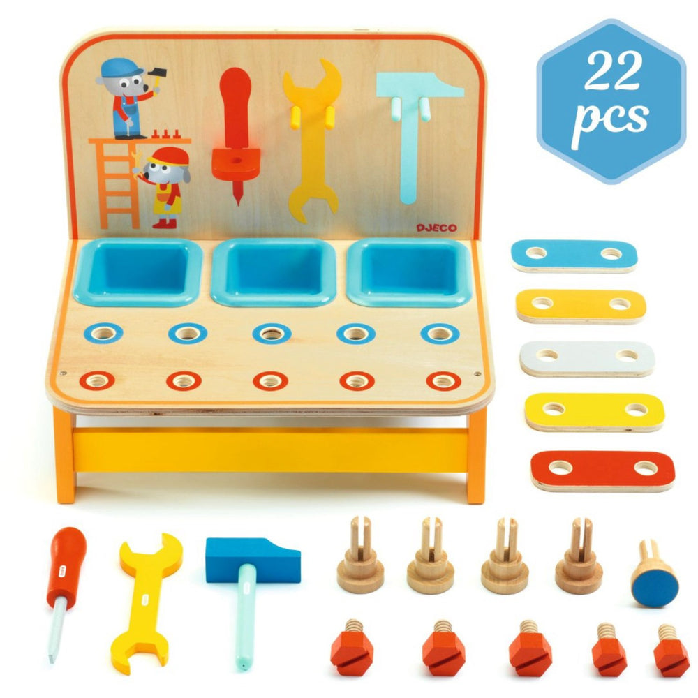 - Indeholder: 1 værktøjsbænk, 1 skruetrækker, 1 skruenøgle, 1 hammer, 5 søm, 5 skruer, 5 små brædder og 3 små opbevaringsbakke