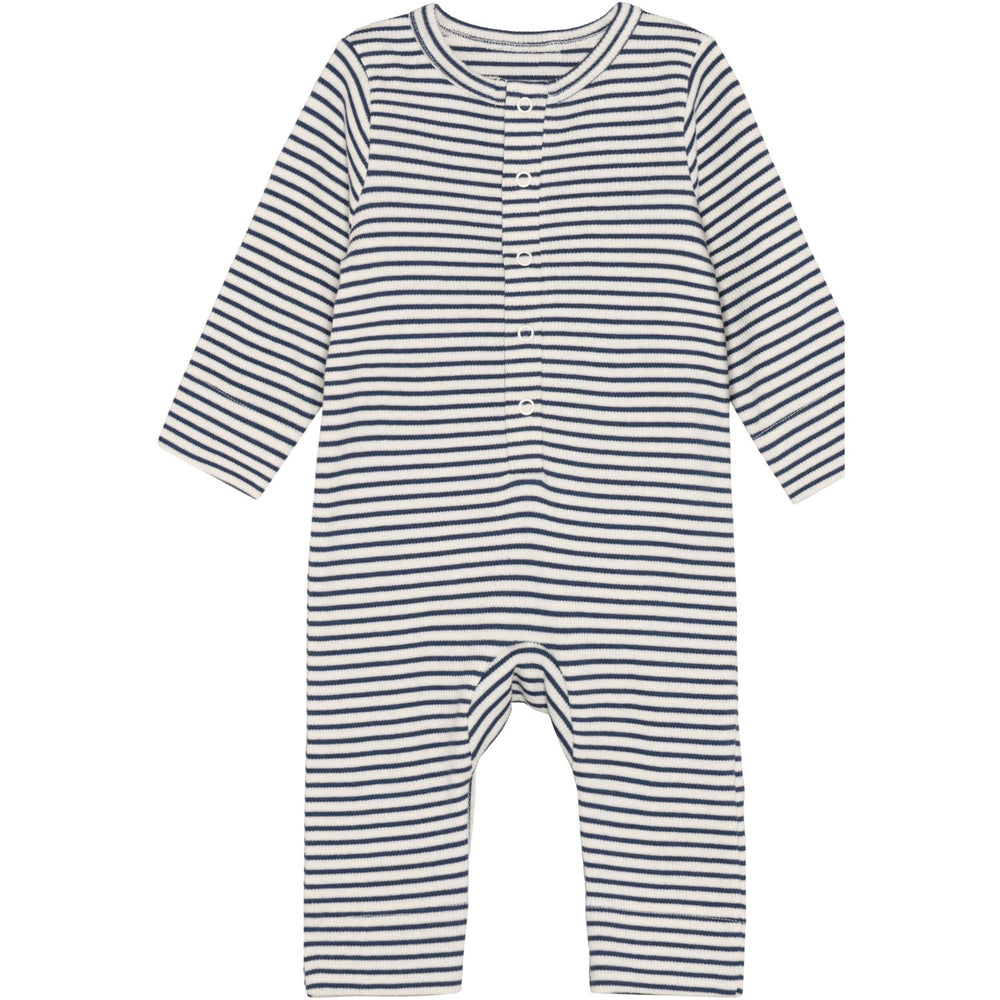 Denne stribede heldragt fra FIXONI i vintage-indigo er både stilfuld og praktisk. Fremstillet i GOTS-certificeret materiale (CERES-0366), sikrer den komfort og kvalitet. Heldragten har en praktisk åbning foran og mellem benene, hvilket gør den ideel til hverdagens puslespil. Passer perfekt til dit barns garderobe.