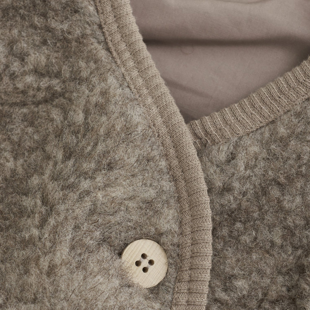 Forkæl din lille én med denne charmerende vest fra HUTTEliHUT. Denne vest er designet med en elegant v-hals og praktiske knapper foran, hvilket gør den nem at tage på og af. Fremstillet i 100% merinould i Teddy-tekstur med foring, tilbyder den både varme og komfort. Farven er i en nedtonet camel melange, som giver et stilrent look. Vestens materiale er ikke kun blødt, men også holdbart, og med korrekt pleje vil den forblive i god stand. Passer perfekt til køligere dage og kan kombineres med diverse underdele for et fuldendt outfit.