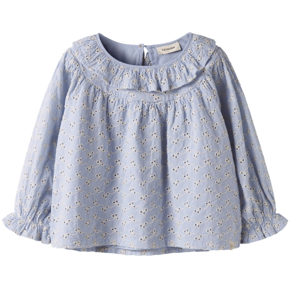 Gør hverdagen særlig for dit barn med Lil'Atelier's Zen Blue Nmftessie Ls Loose Skjorte. Denne charmerende skjorte er fremstillet i blødt materiale og designet med øje for detaljen, hvilket sikrer både stil og komfort. Med dens unikke broderie anglaise, som præsenterer fine udskæringer, tilføjer den et strejf af elegance og sødme til barnets garderobe. Skjorten har en praktisk knap-under-kraven lukning, lange ærmer med elastiske manchetter for optimal pasform, og er dekoreret med flæser for et yndigt look. Perfekt til både fest og hverdagsbrug.