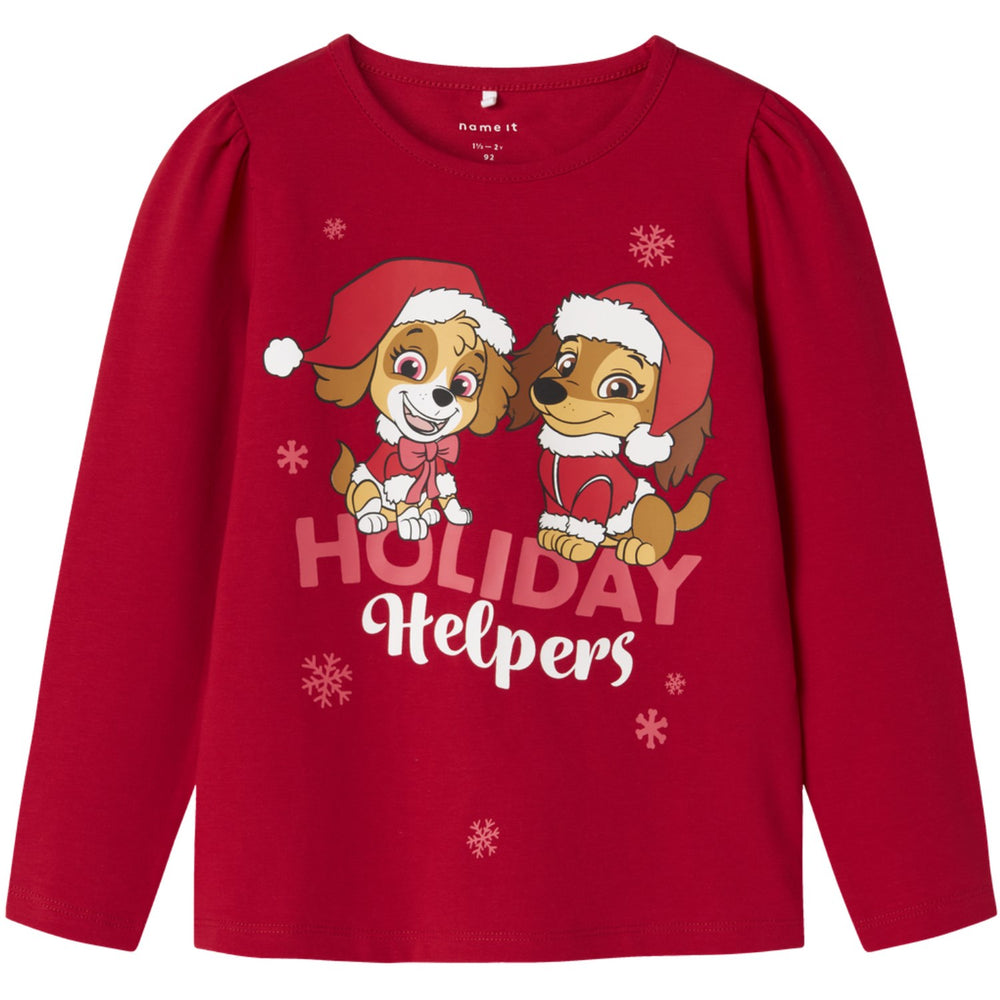 Gør julen festlig med denne charmerende 'Name It Barbados Cherry Nmfsasa Paw Ls Top Cplg'. Toppen er fremstillet i blødt jersey, der er både let og strækbart, hvilket sikrer optimal komfort og bevægelsesfrihed for dit barn. Det ikoniske Paw Patrol-tema pryder designet med en gummiprint, der føles blød mod huden. Denne top kommer med rund hals, lange pufærmer og en standard pasform, der passer perfekt til daglig leg og julesammenkomster.