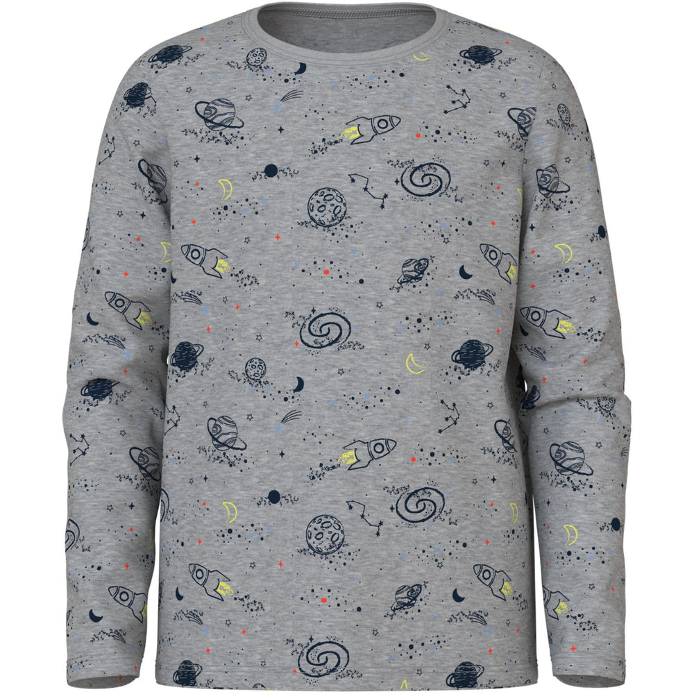 Med Name It Grey Melange Nkmnightset Grey Space Noos natsættet kan dit barn glæde sig til behagelige nætters søvn. Lavet af blødt jersey stof, sikrer dette sæt både strækbarhed og blødhed, perfekt til fri bevægelse og komfort. Pyjamasen har lange ærmer, ribkanter og en elastik i taljen, der tilbyder optimal pasform. Det sjove rumtema fordelt over hele sættet vil uden tvivl være et hit hos de små.