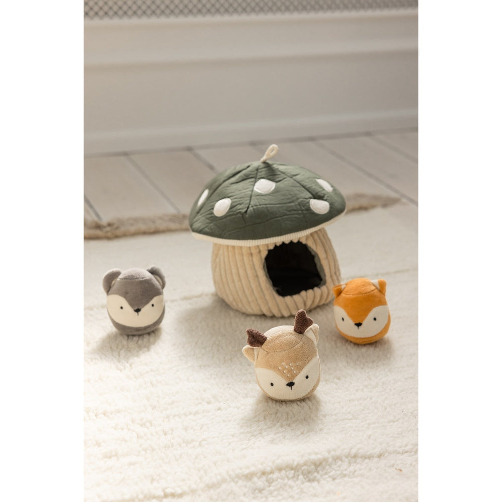 Sebra Mushroom Aktivitetslegetøj Hide & Seek inviterer dit barn ind i en verden af nysgerrighed og udvikling. Denne charmerende legetøjssvamp, designet i bløde materialer og tiltalende farver, er perfekt til små børn. Med en højde på 20 cm har barnet let ved selv at interagere med de tre skjulte dyr, som hver især byder på forskellige lydeffekter og stimulerer både hørelse og finmotorik.