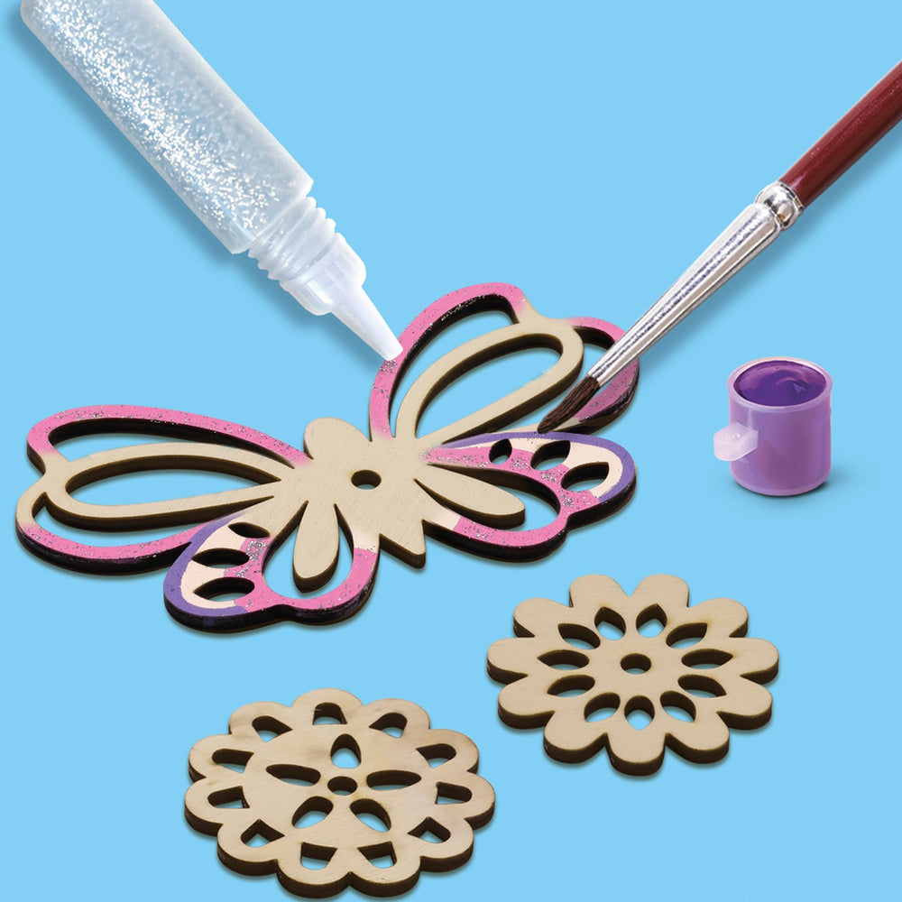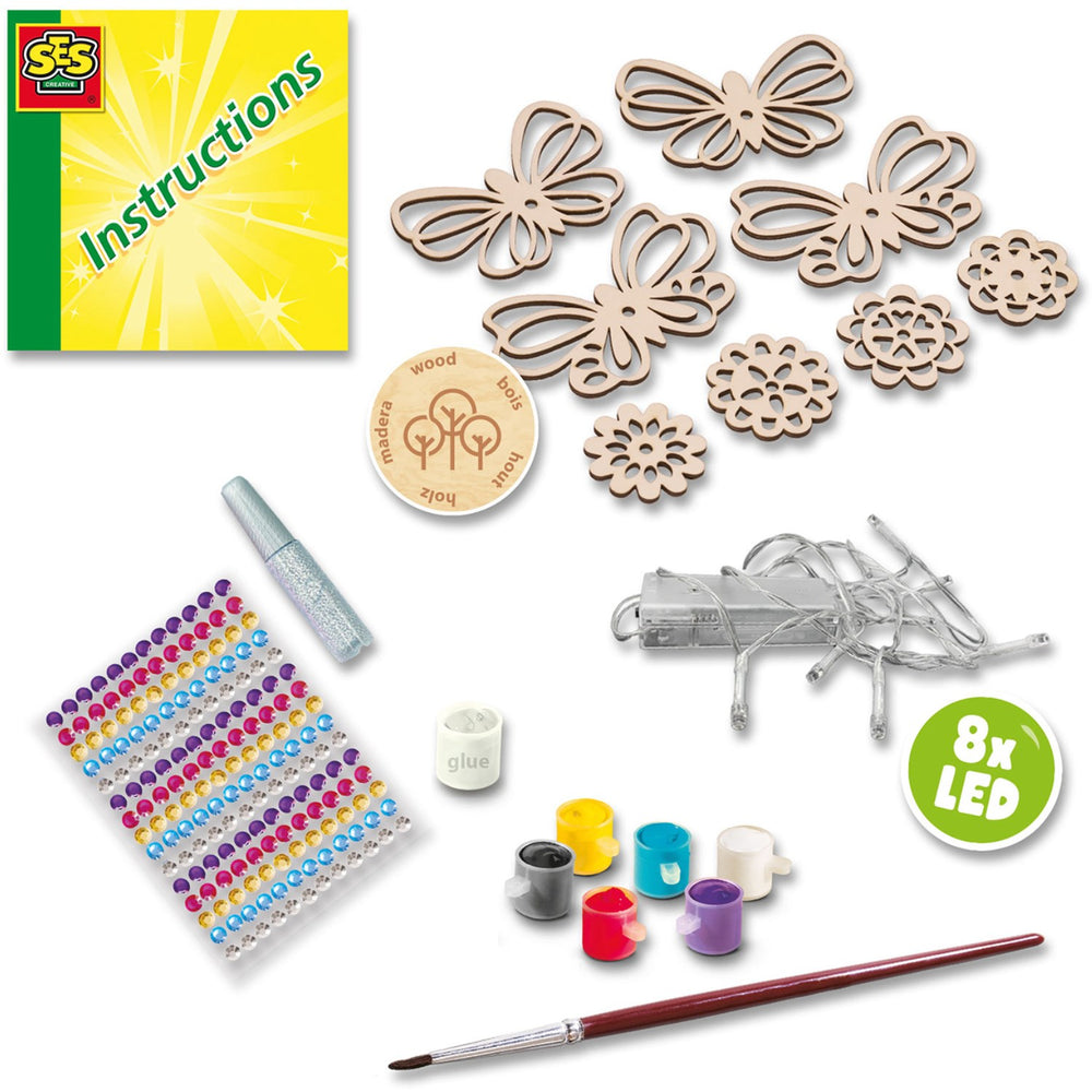 - Indhold: Lyskæde med 8 LED lys, 5 x selvklæbende diamanter, maling, lim, pensel, sommerfugle, blomster og vejledning