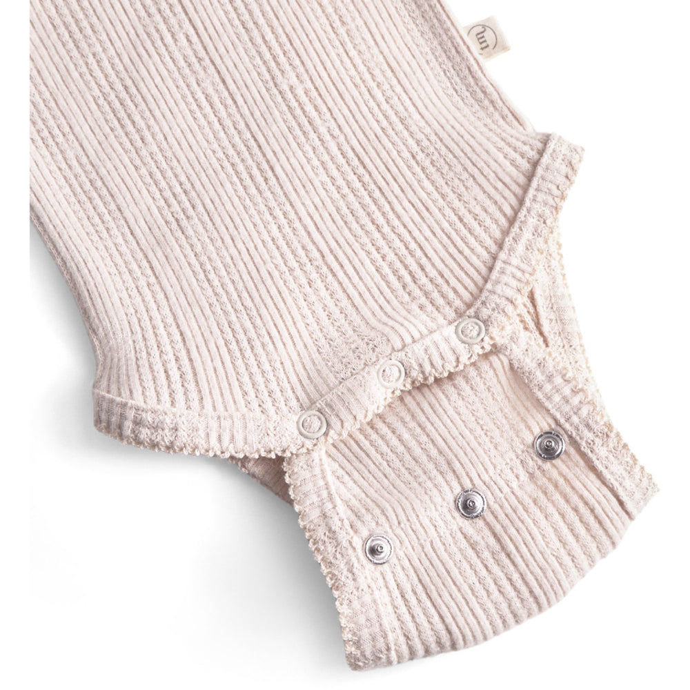 Denne charmerende Signe bodystocking fra That's Mine er fremstillet i blød, børstet pointelle med et fint broderet hjerte foran. Designet er tænkt til at vokse med barnet, takket være de justerbare metalknapper. Perfekt for både komfort og stil, og sikker for dit barns sarte hud.