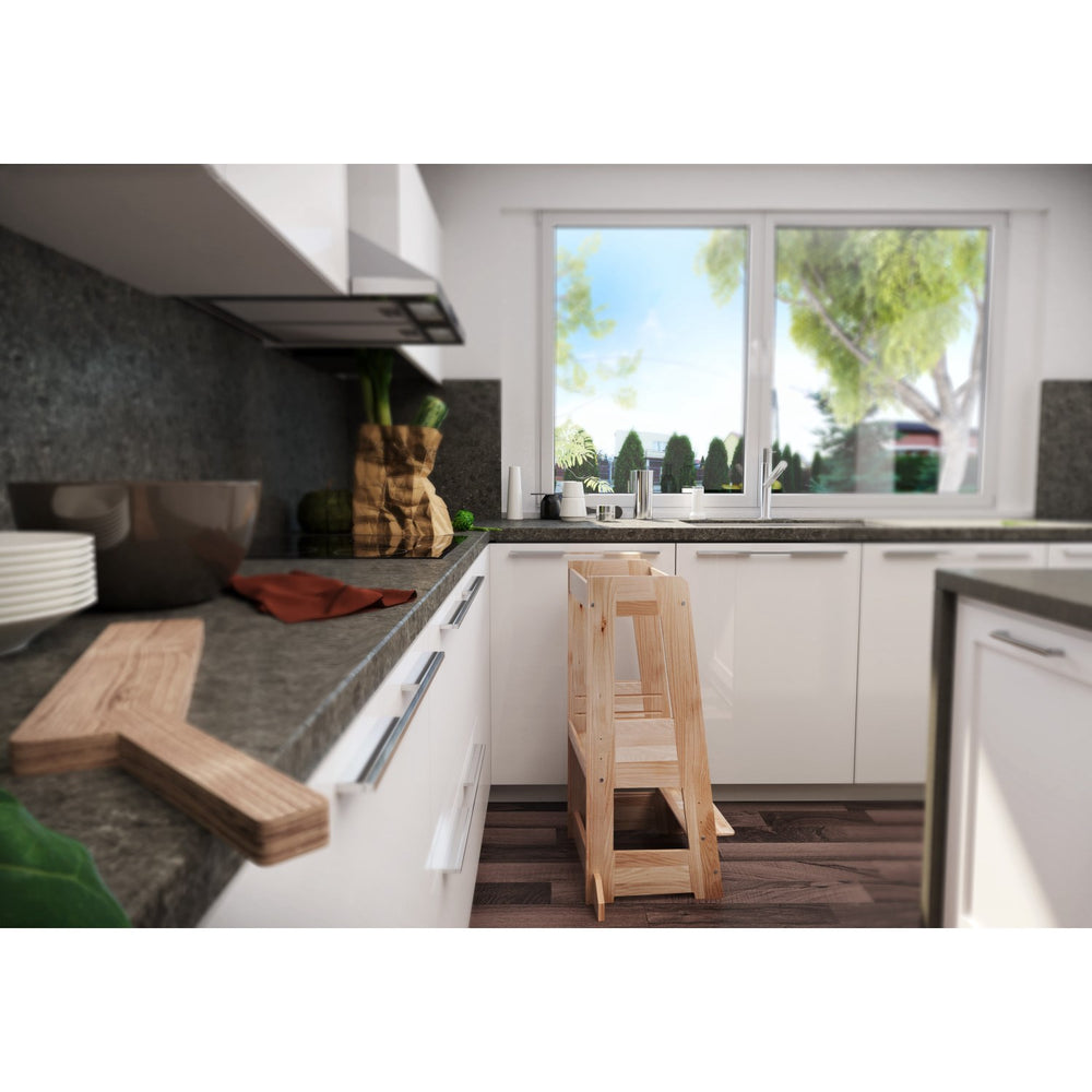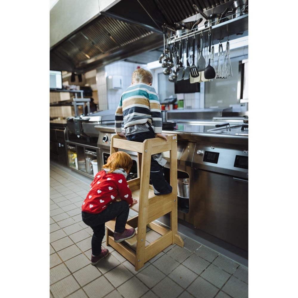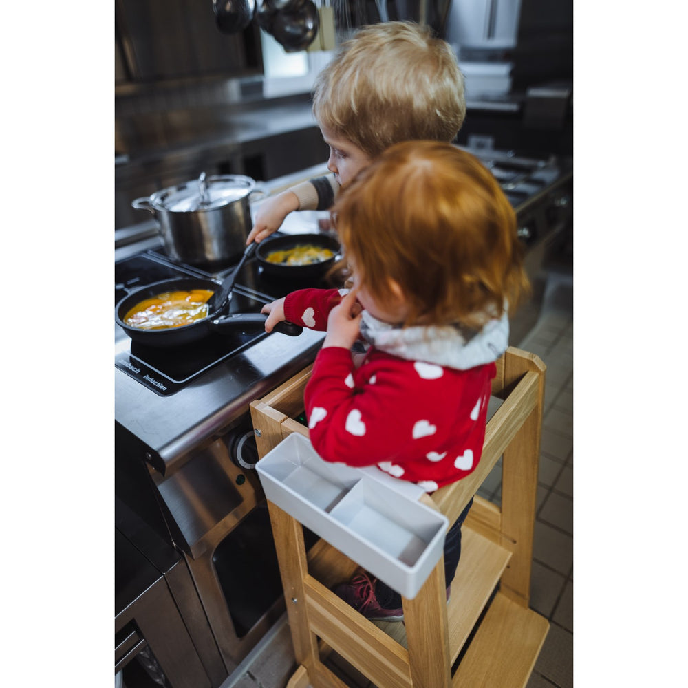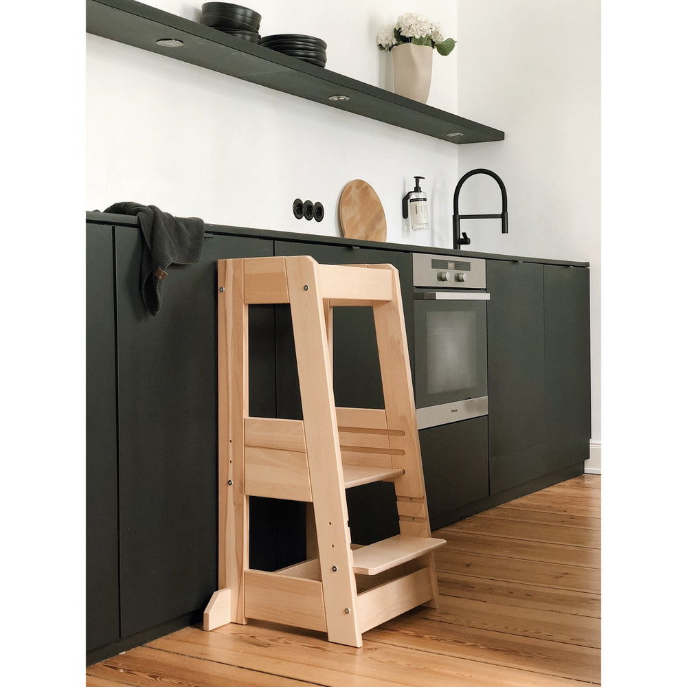 Med tiSsi® Nature Felix Læringstårn får dit barn mulighed for at deltage aktivt i dagligdagen på køkkenets niveau. Lavet af massiv bøg, justeres tårnet let til tre forskellige højder, hvilket sikrer en sikker og ergonomisk position for dit barn, mens det vokser. Det forbedrer barnets motorik og gør det muligt for dem at engagere sig i madlavning eller andre aktiviteter ved bordet og lære værdifulde sociale færdigheder. En perfekt måde at styrke familiebåndet på og udvikle barnets selvhjulpenhed.
