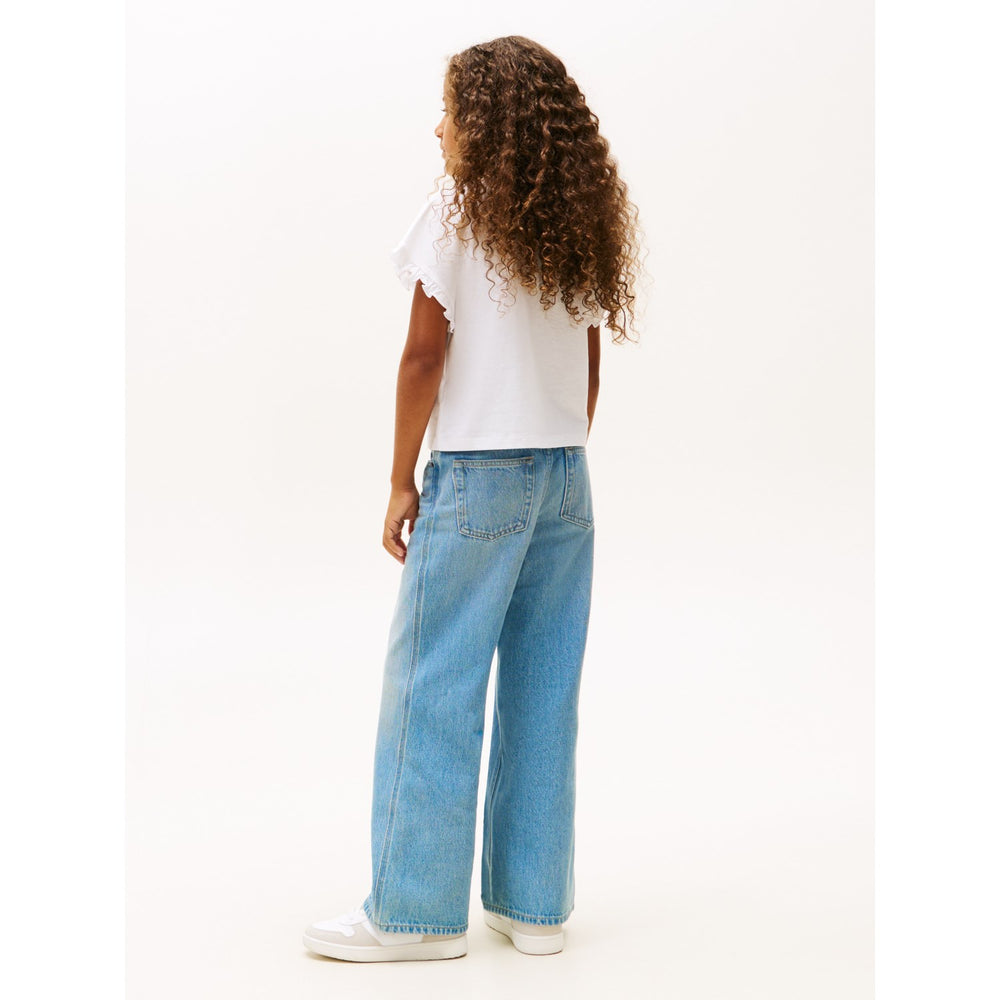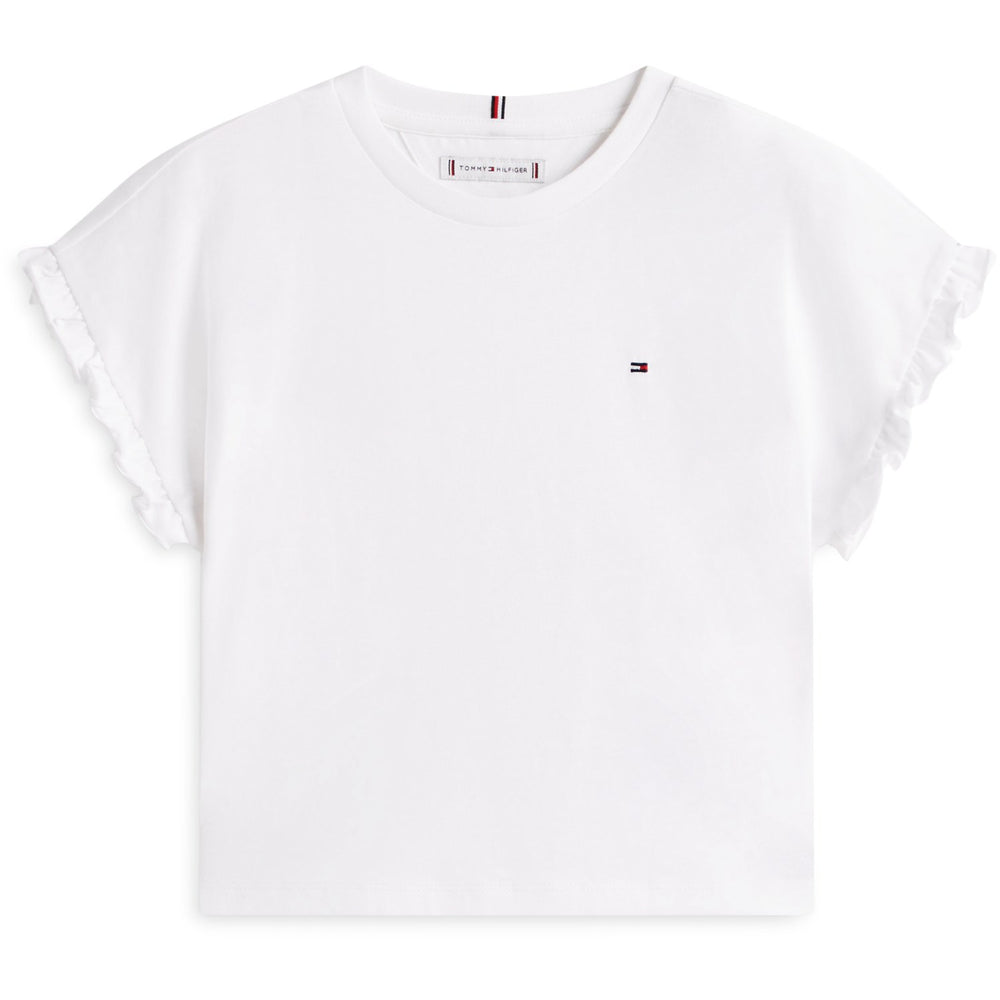 Oplev Tommy Hilfiger White Essential T-Shirt til børn, fremstillet i en behagelig bomuldsblanding. Denne t-shirt præsenteres i klassisk hvid med diskret logo, der tilføjer et stilrent touch. Perfekt pasform og let at vedligeholde, hvilket gør den ideel til hverdagsbrug.