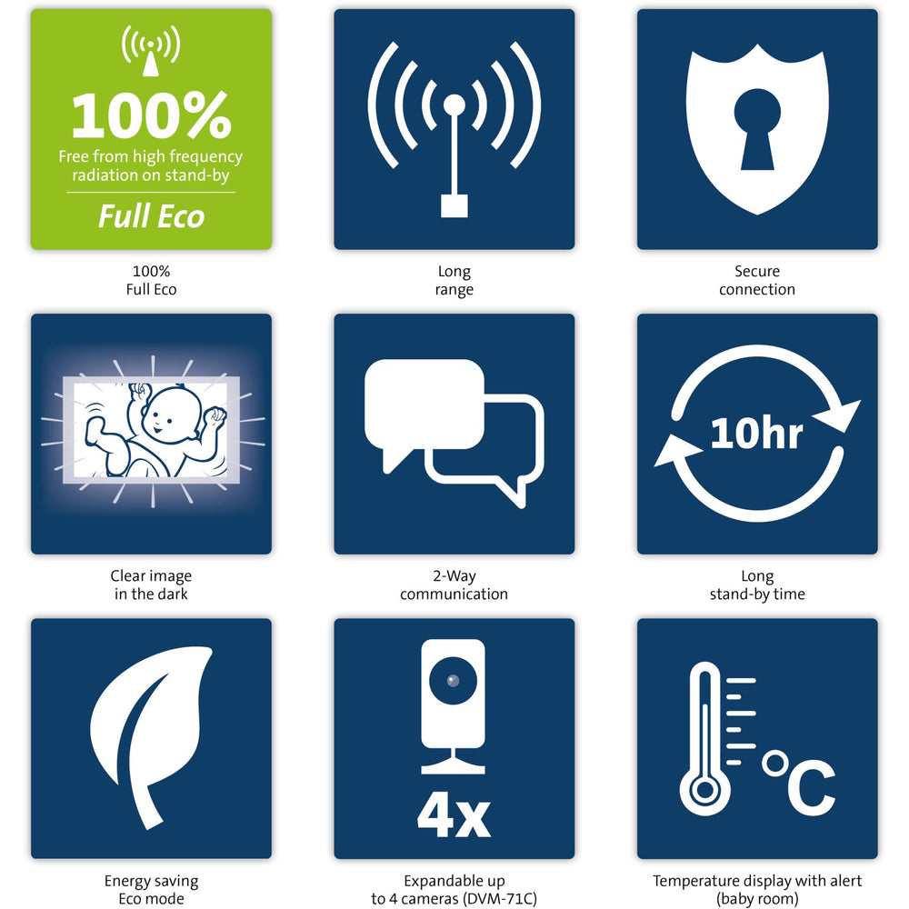 Alecto Baby DVM-71 er din pålidelige partner i forældreskabet med sit 2,4 tommer farvedisplay og evnen til at koble op til 4 kameraer, hvilket gør den ideel til voksende familier. Udstyret med krystalklart nattesyn og talk back-funktion, sikrer denne babyalarm, at du altid kan holde øje med dit barn - dag og nat. Den intuitive brugerflade gør det nemt at betjene alarmen, hvilket giver tryghed uden besvær. Med energibesparende øko-tilstand og en rækkevidde på op til 300 meter, kombinerer Alecto Baby DVM-71 sikkerhed med bekvemmelighed i hverdagen.
