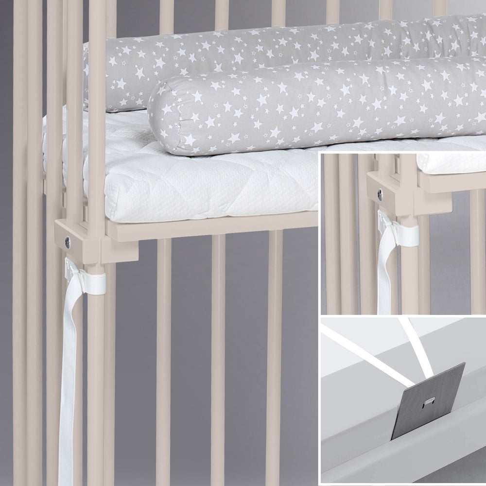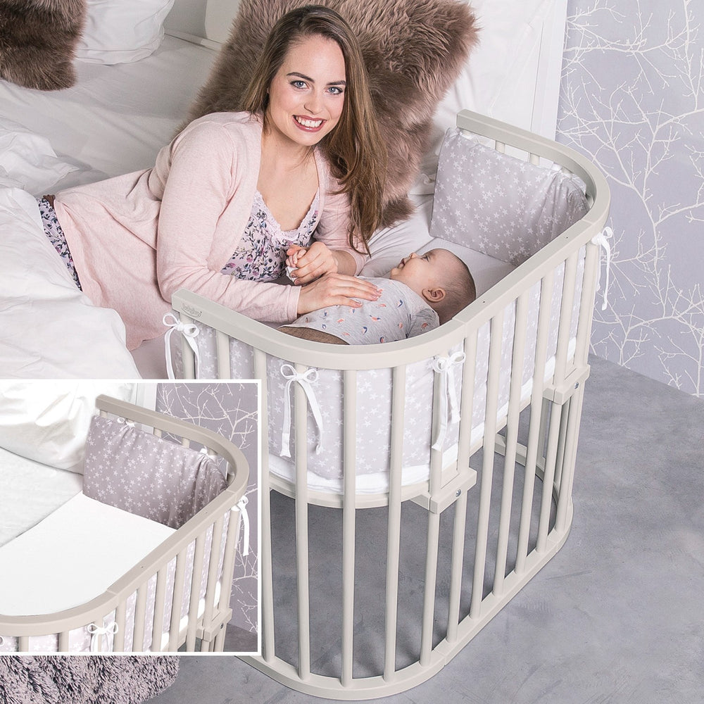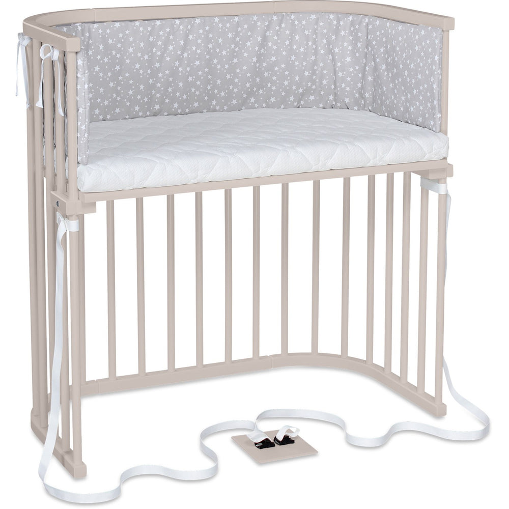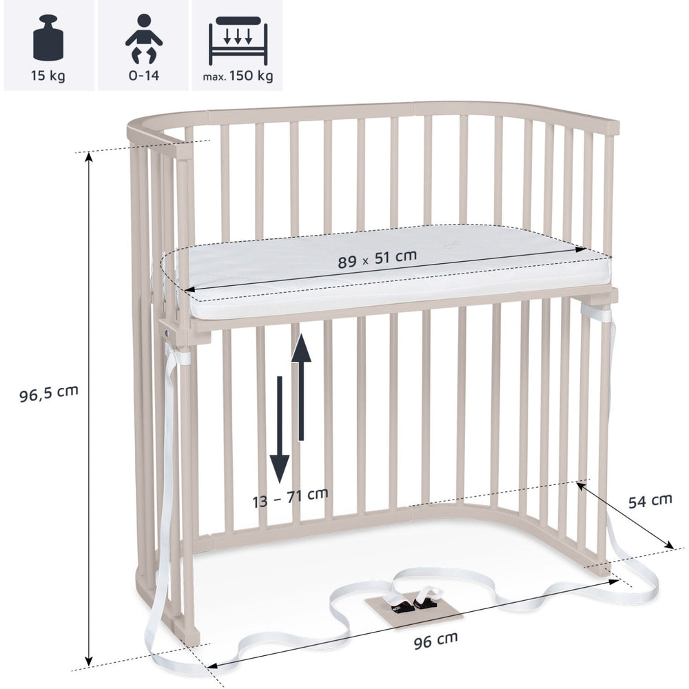 babybay® Boxspring i flot beige bøgetræ er udviklet til senge med høj liggeflade, som fx boxspring-senge. Den trinløse højdejustering gør det muligt at tilpasse sengen præcist – uden mellemrum til forældresengen.
