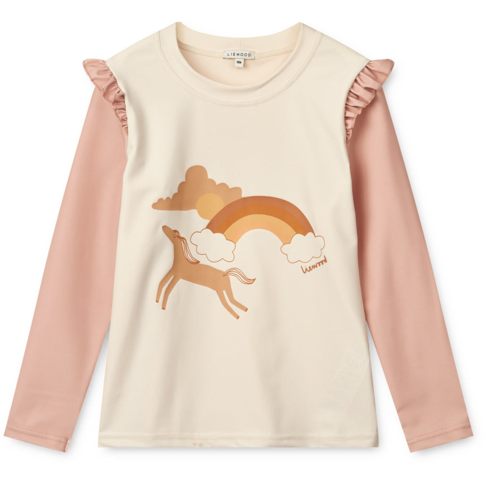 Denne charmerende Tenley badebluse fra LIEWOOD i farverne Pale Tuscany og Ecru er fremstillet i hurtigtørrende og åndbart materiale. Med en UV40+ beskyttelsesfaktor sikrer den optimal sikkerhed mod solens stråler, mens det legesyge print og de dekorative flæser ved skuldrene tilføjer stil og karakter. Perfekt sammen med et par koordinerende LIEWOOD badebukser og en solhat for fuldendt solbeskyttelse ved stranden eller i poolen.
