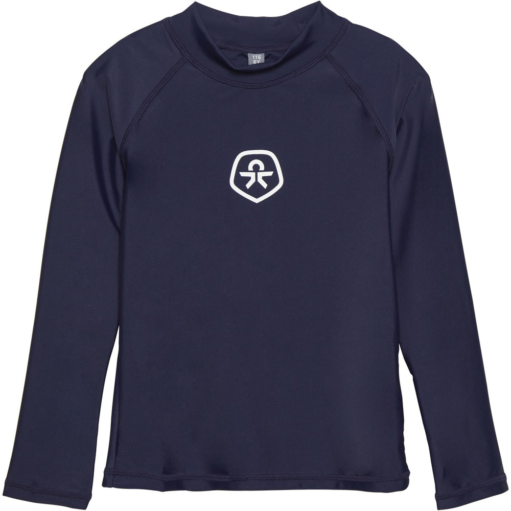 Lækker ensfarvet badebluse fra Color Kids, designet med et tydeligt logo på forsiden. Denne langærmede T-shirt er fremstillet i et strækbart, hurtigttørrende materiale, der sikrer optimal komfort og bevægelsesfrihed til legende børn. Med UPF 40-beskyttelse og CE-mærkning er denne bluse ideel til solrige dage ved stranden eller poolen.