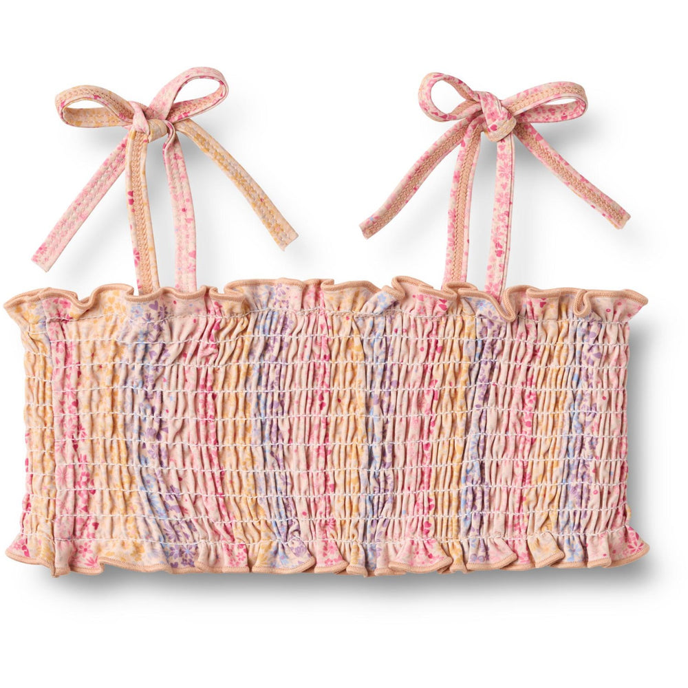 Denne charmerende Wheat Multi Rainbow Bikini Carla fremhæver sit unikke hvedesign og farverige print, som vil glæde enhver lille badenymfe. Bikiniens små smockdetaljer og smalle skulderstropper, dekoreret med fine sløjfer, tilføjer stil og charme, mens det komfortable snit sikrer fri bevægelighed. Fremstillet af 83% genanvendt polyester og 17% elastan, garanterer denne bikini, at dit barn kan lege frit i vandet. For optimal vedligeholdelse, husk at vaske badetøjet efter brug i klor- eller saltvand.
