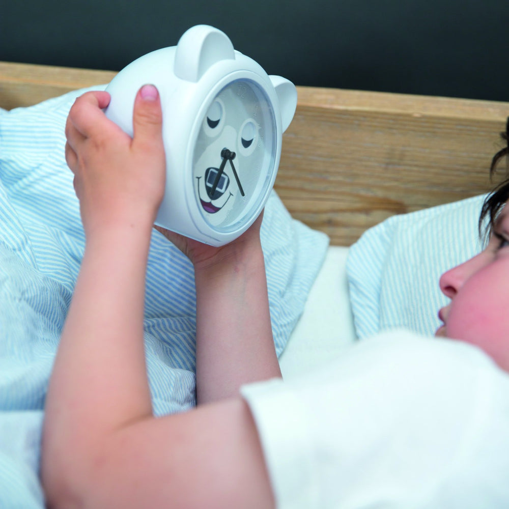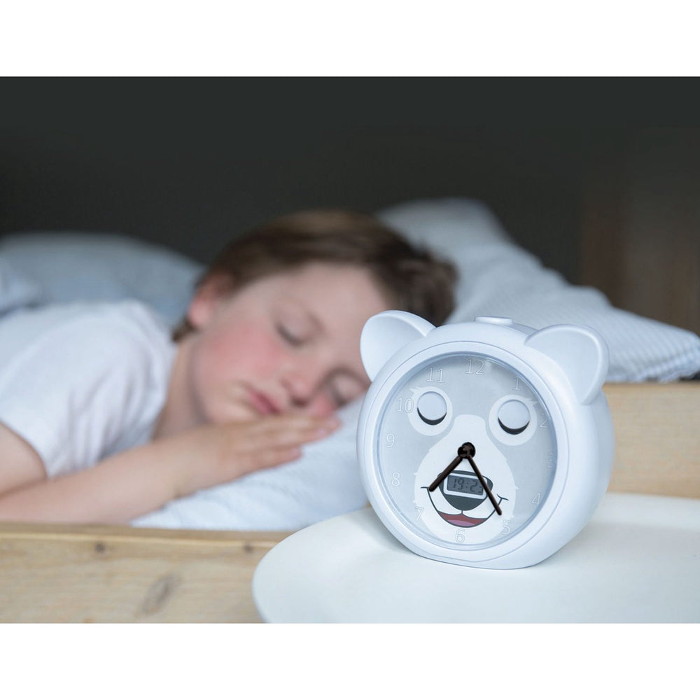 BOBBY The Bjørn er ikke kun en charmerende søvntræner og ur perfekt til børneværelset, men også praktisk for både barn og forældre. Designet hjælper børn med at forstå og respektere deres søvnrytmer ved at åbne og lukke øjnene på de fastsatte tidspunkter. Dette lærer dem, hvornår det er tid til at sove og stå op. Først som ur til de mindste med åben og lukket øjne-funktion, og senere som et vækkeur med justerbar lydstyrke for de ældre børn. Lavet i holdbart og børnesikkert ABS materiale, er dette en sikker tilføjelse til ethvert børnerum. BOBBY understøtter opbygningen af sunde søvnrutiner og giver velkomne pauser for forældre.