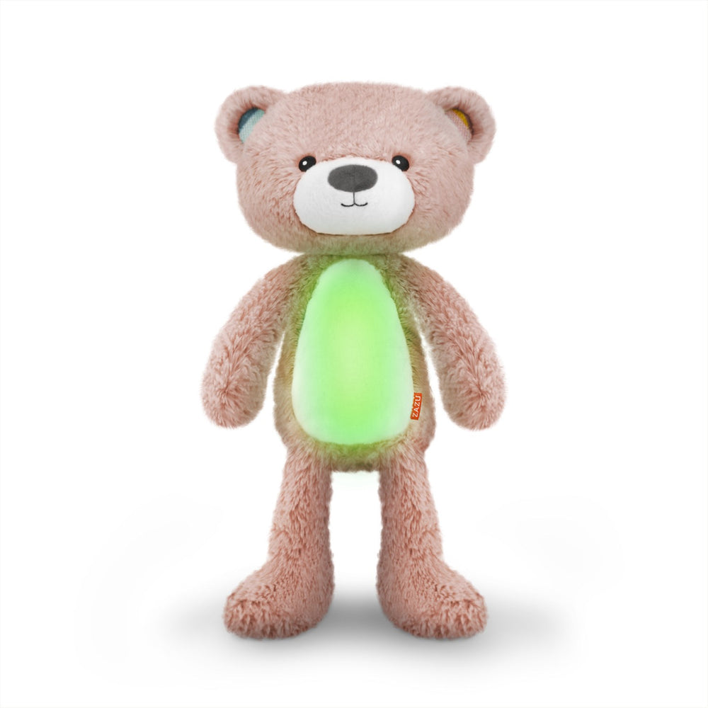 Brody Bjørnen fra Zazu er mere end blot en natlampe; den er en integreret søvntræner og spilledåse designet til at støtte både dit barns og din egen søvnrytme. Med evnen til at lære dit barn forskellen på dag og nat, tilbyder Brody et beroligende rødt lys og afspiller blide vuggeviser eller naturlyde, som hjælper med at falde til ro. Funktionen som søvntræner bruger farvesignaler i Brodys mave til at guide barnet: rødt for nat, orange som en advarsel om snarlig morgen og grønt for at det er tid til at stå op. Disse klare signaler giver dit barn en følelse af tryghed og lærer selvstændighed omkring sengetider. Brody er lavet i blødt materiale med aftageligt lyd- og lysmodul, så den også er nem at vaske. Perfekt til forældre, der ønsker at styrke nattesøvnen og give barnet en tryg og kærlig ven i mørket.