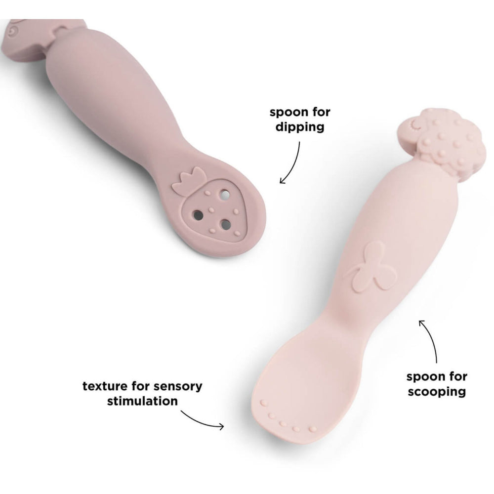 - Ekstra: • Bløde skeer, der er perfekte til, når din baby skal udforske mad i sit eget tempo • En ske til at dyppe og smage og en ske til at spise med • Formerne og teksturerne gør det nemt for små hænder at bruge • Fremstillet af fødevaregodkendt silikone, fri for BPA og andre skadelige stoffer • Kan bruges i mikrobølgeovn og vaskes i opvaskemaskine • Materialet er stærkt og langtidsholdbart • Søde pudderfarver med Pigee- og Sheepy-figurer