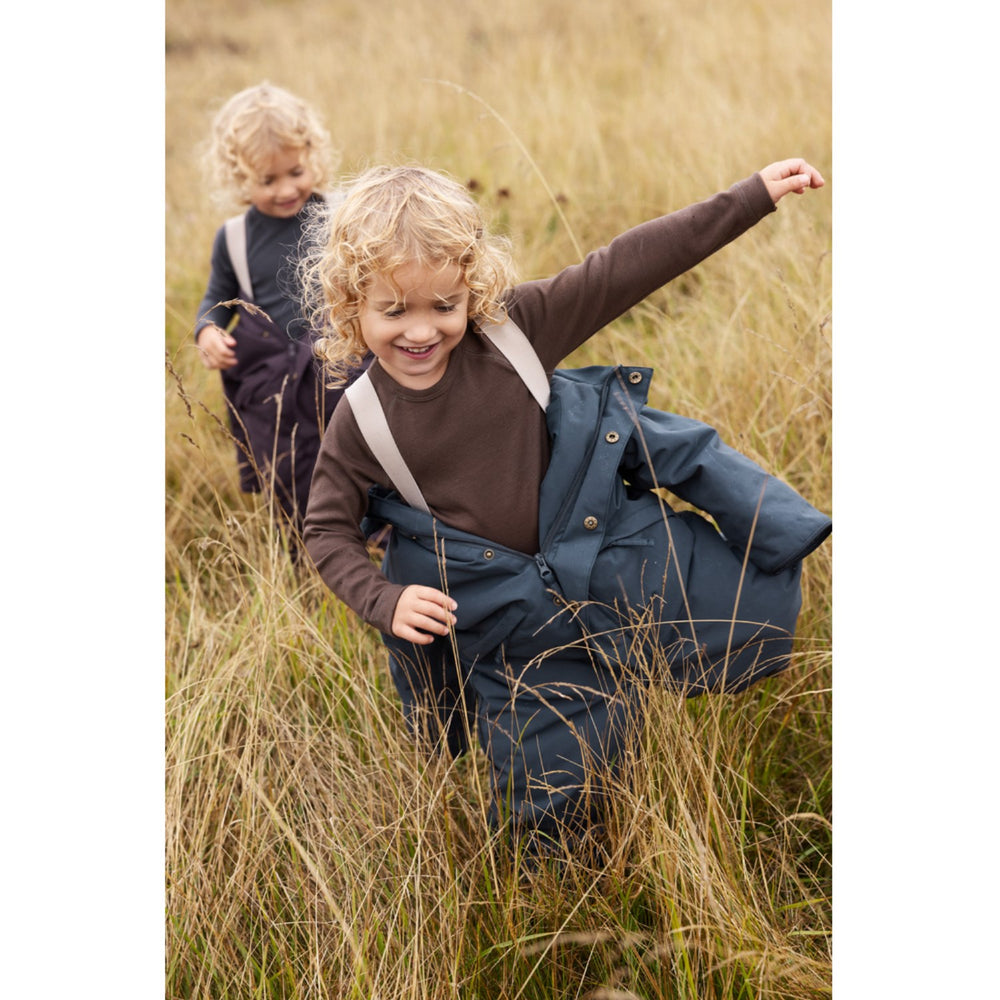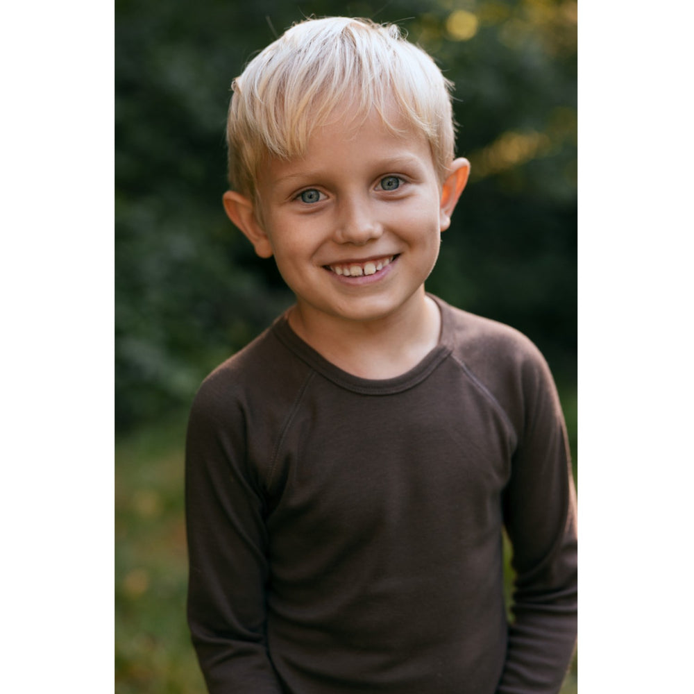 Denne langærmede ensfarvede t-shirt fra MarMar er skabt til børn, der elsker komfort og stil. Fremstillet med raglanærmer for maksimal bevægelsesfrihed, præsenteres den i en dyb chokoladebrun nuance. Perfekt til hverdag og leg, denne bluse kombinerer funktionalitet med enkel stil. Tøjet er let at passe og holdbart, så det holder til mange timers leg og vask.