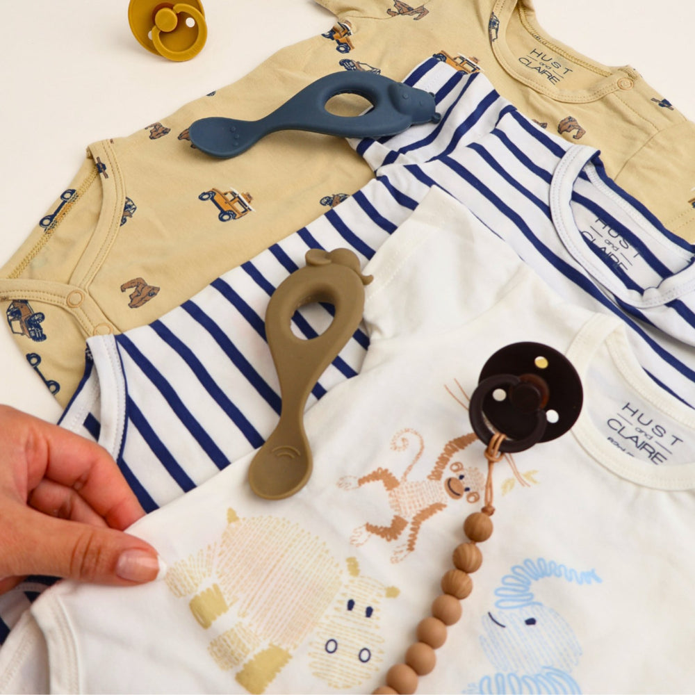 Denne pakke med tre Hust & Claire Bertram bodystockings kombinerer funktionalitet med charmerende stil. De kortærmede bodies i pale khaki er fremstillet af blød, strækbar bomuld, der sikrer komfort til dit barn. Hver body har unikt design: én med klassiske striber, én med et livligt bilmotiv og én med et sødt dyremotiv fortil. Praktisk med knapper på venstre skulder og mellem benene for let omklædning.