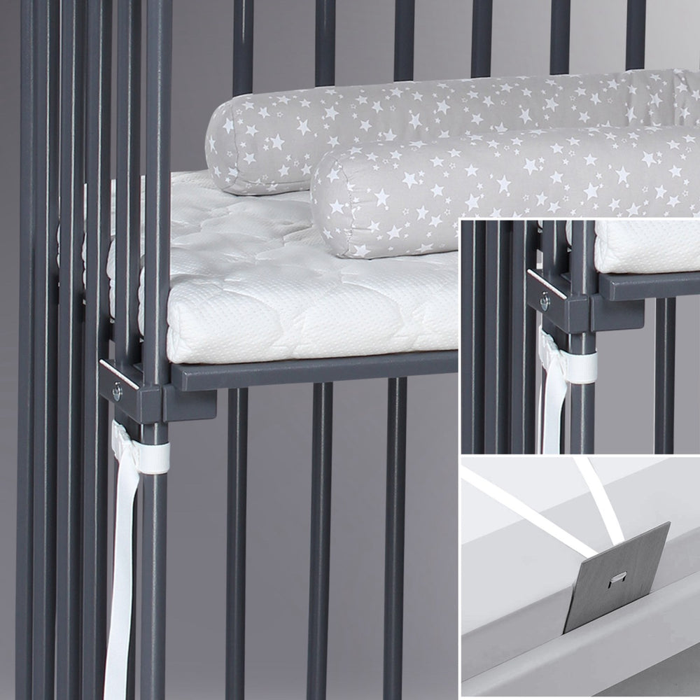 Fastgøres nemt med bæltebeslag – helt uden værktøj. Den ventilerede bund sikrer et sundt sovemiljø med god luftcirkulation.