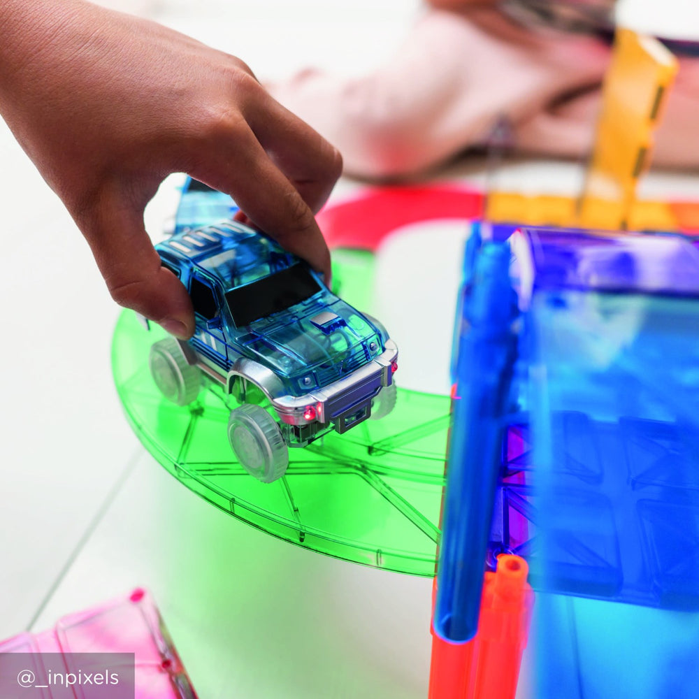 Forkæl dit barn med Cleverclixx Blå Racerbanebil, det perfekte tilbehør til enhver Cleverclixx racerbane. Denne magnetiske bil er designet til at skabe timevis af underholdning med dens blinkende forlygter og glatte køreegenskaber. Nem at betjene med blot et AA-batteri, denne bil er ideel for små hænder og hjælper med at udvikle finmotorikken og forståelsen for årsag og virkning. Med sin kompakte størrelse er den let at opbevare og tage med på farten. Et fantastisk supplement til legedage, der styrker båndet i familien ved at skabe sjove og lærerige øjeblikke sammen.