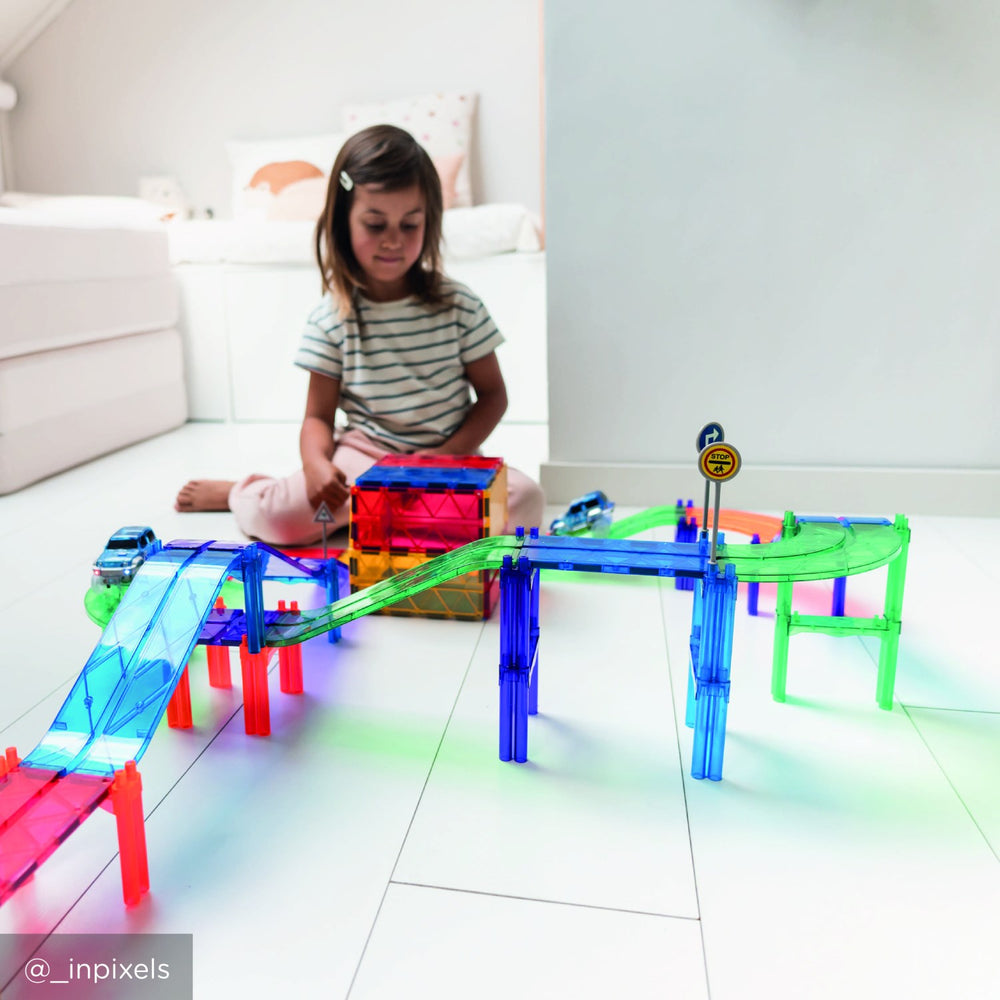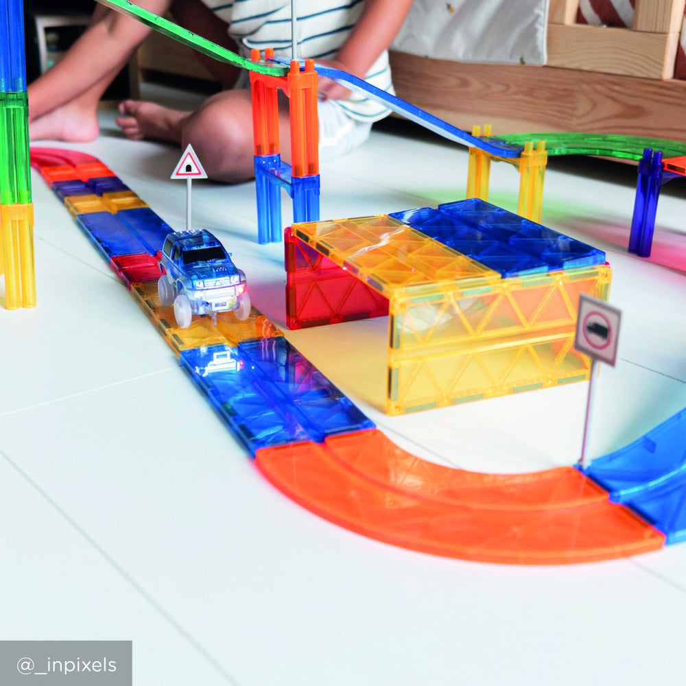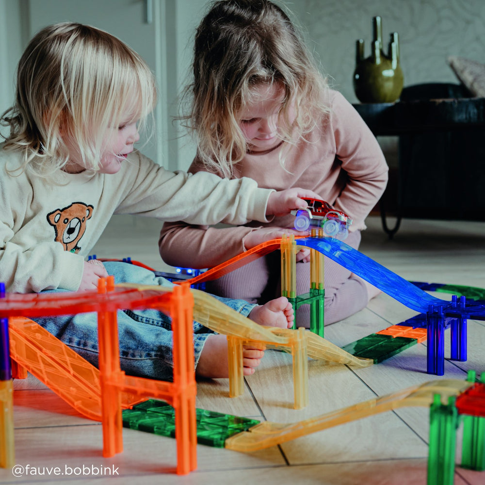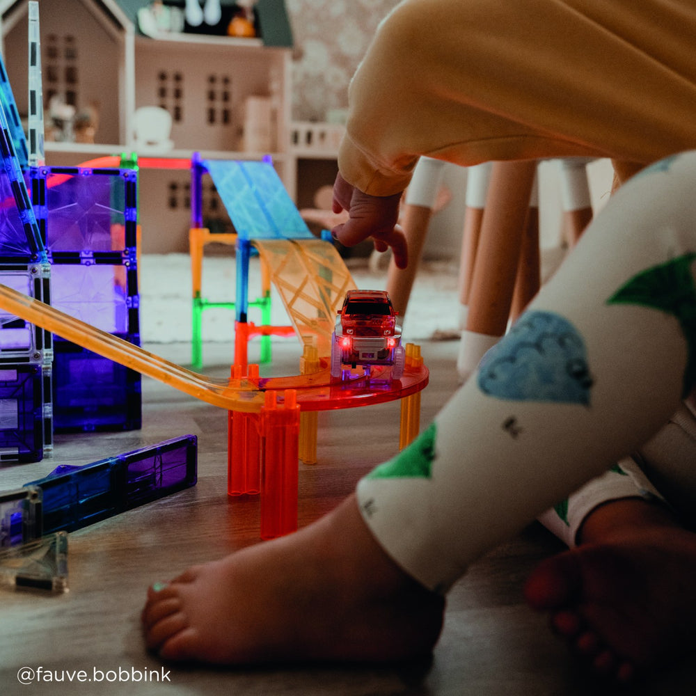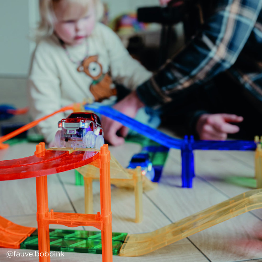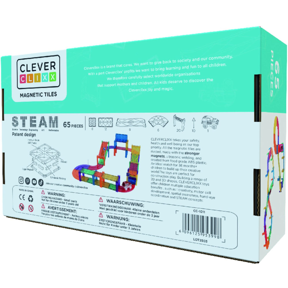 Oplev spændingen med Cleverclixx Intense Race Track, en magnetisk racerbanepakke bestående af 65 dele. Perfekt til børn, der elsker fart og kreativ leg, hvor de kan designe og konstruere utallige racerbanekombinationer. Sættet inkluderer trafikskilte, en racerbil og søjler, der bidrager til realistisk og interaktiv leg. Ideelt for små ingeniører til at udvikle rumlig forståelse og problemløsningsevner på en underholdende måde. Nemt at samle, opbevare og medbringe. Dette legetøj giver timevis af underholdning og styrker familiebånd ved fælles aktiviteter.