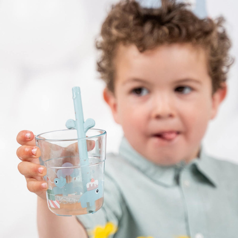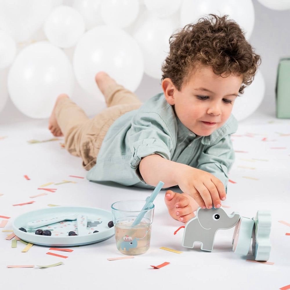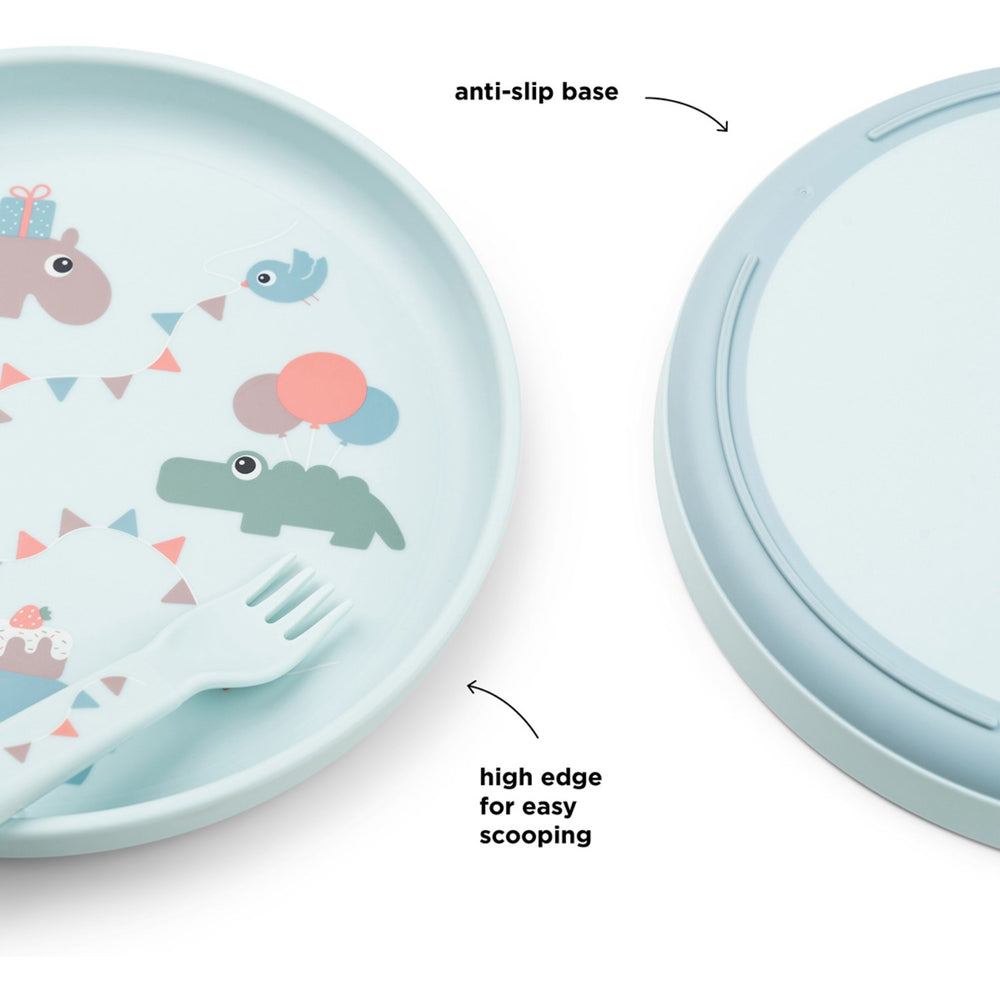 Lad de små dykke ned i måltidet med DonebyDeer Blå Foodie Spisessæt Celebration! Dette charmerende sæt i livlige blå nuancer inkluderer en tallerken, glas, kniv, gaffel samt en lille bog, alle dekoreret med festlige Deer friends-motiver. Den skridsikre bund på tallerkenen sikrer, at maden bliver hvor den skal, selv under de mest energiske middage. Efter brug kan hele sættet nemt genanvendes. Det ideelle valg for enhver lille festdeltager, der elsker at spise med stil!