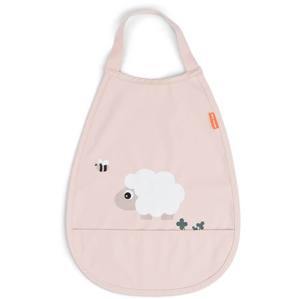 • Ekstra: • Pull-over hagesmæk med en lomme til at fange tabt mad • Den elastiske strop gør den nem at tage på, og dit barn kan gøre det selv • Den vandafvisende overflade beskytter tøj og gør den let at rengøre • Sød pudderfarve med et underholdende motiv af Sheepy