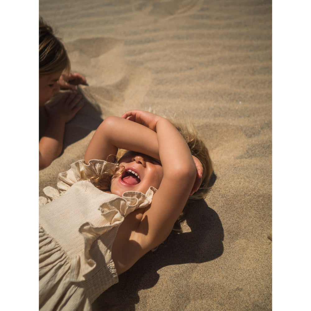 Gør garderoben klar med MarMar Fine Cotton Dijon Stripe Danita Frill Kjole. Denne charmerende stropkjole er fremstillet i 100% naturmateriale, som sikrer åndbarhed og komfort. Med sin løse pasform, flæser på skuldrestropperne og stribe mønster, er den både stilfuld og praktisk. Perfekt til legedage eller særlige begivenheder. Let at vedligeholde og holdbar over tid.