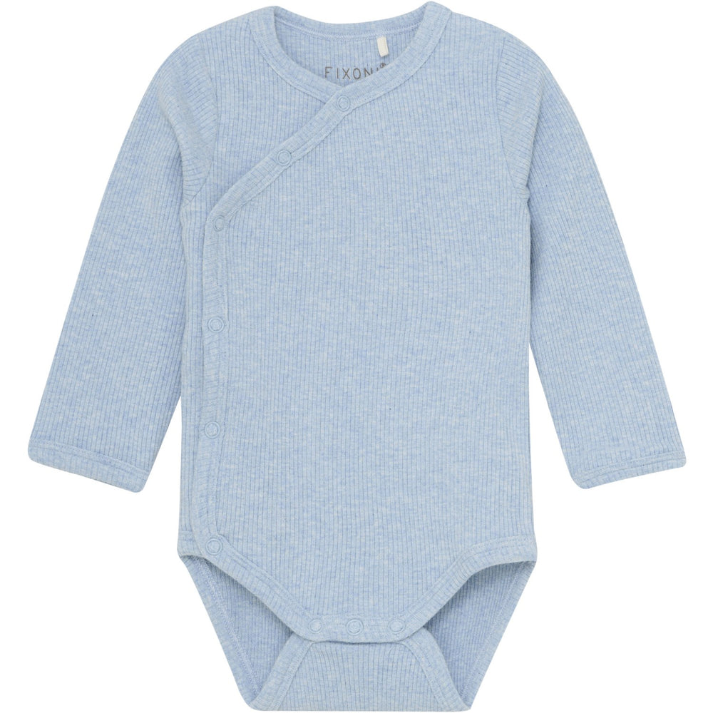 Denne ensfarvede blå 'Blue Fog Melange Wrap Body' fra FIXONI er designet med en praktisk slå om-effekt og sikker trykknaplukning både foran og mellem benene. Fremstillet i behagelig rib, sikrer den god strækbarhed og en fleksibel pasform, ideel til dit barns bevægelse. Inkluderer holdbare TENCEL™ fibre, som er kendte for deres kvalitet og komfort.