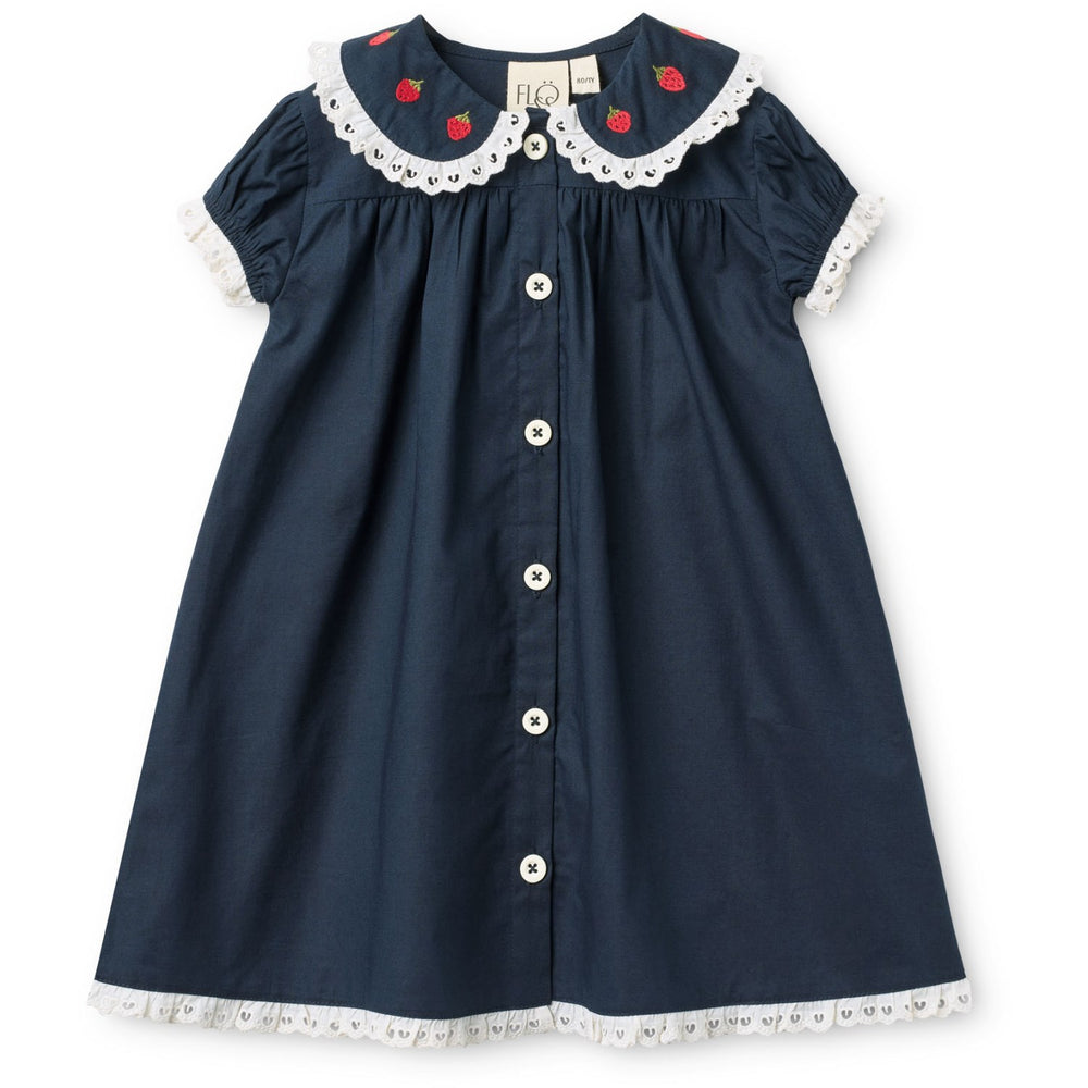 Aya-kjolen fra Flöss New Navy tilbyder klassisk charme med sine detaljerede jordbærbroderier på Peter Pan-kraven. Fremstillet i 100% bomuld sikrer den optimal komfort og åndbarhed for børn. Designet inkluderer puffer-ærmer og en rynket bæreplade, som tilføjer et sødt og stilfuldt udtryk. Blondeindsatser ved kraven, ærmerne og langs sømmen sammen med de dekorative runde plastikknapper foran, gør kjolen ideel til både hverdagsbrug og særlige lejligheder.