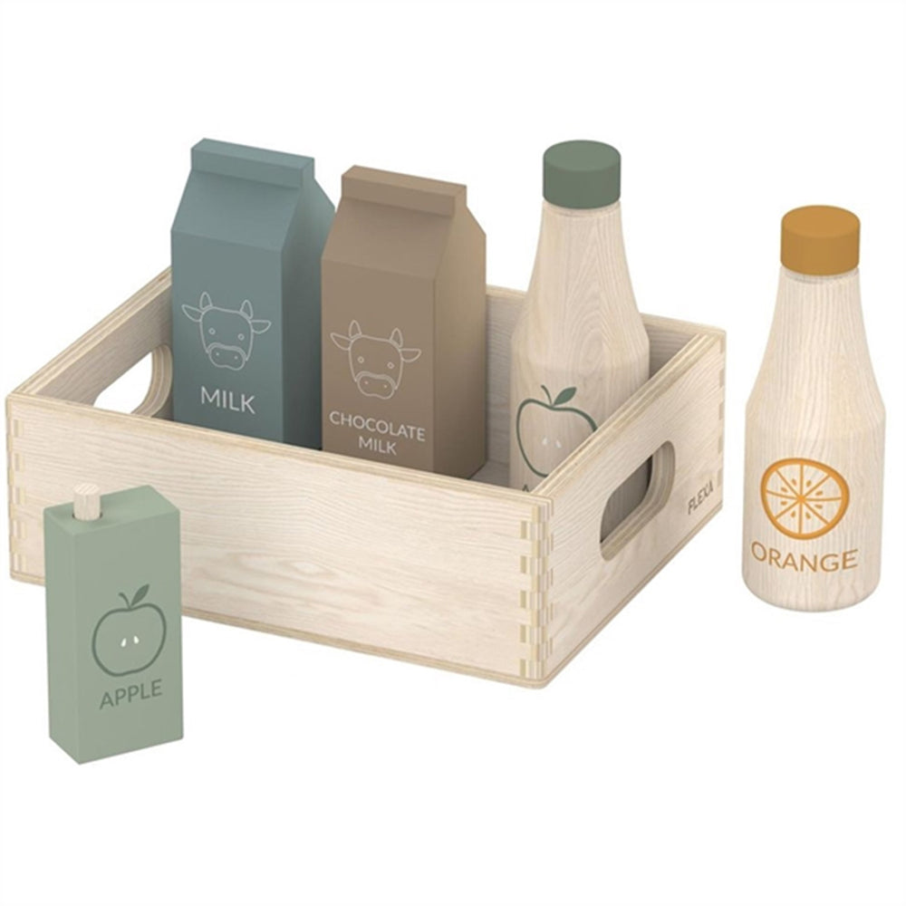 - Ekstra: Købmandsvarer. Sæt med 6 dele. Indeholder mælk, kakaomælk, appelsinjuice, en flaske æblejuice, en lille brikjuice og en trækasse. Fremstillet af massiv birk og birkekrydsfiner. Fremstillet af FSC™-certificeret træ.