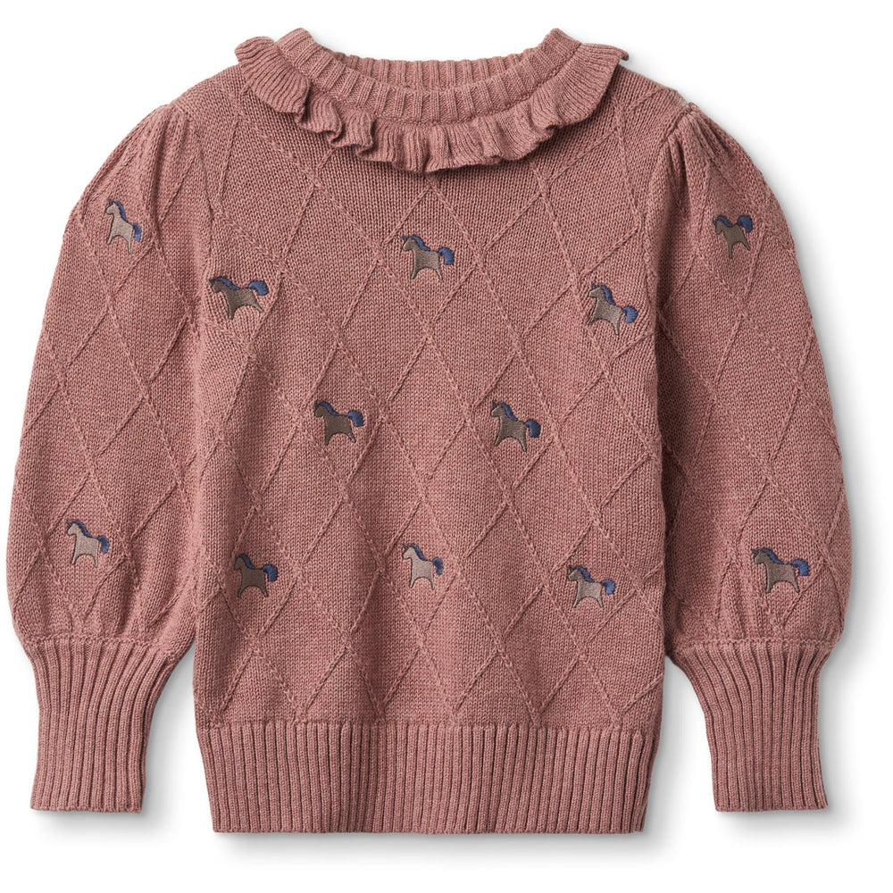 Denne charmerende Fliink Ash Rose Lucie Unicorn pullover er fremstillet i en blød blanding af 85% økologisk bomuld og 15% uld, hvilket sikrer både varme og komfort for dit barn. Pulloveren er prydet med et iøjnefaldende harlekinmønster og søde, broderede enhjørninger på ærmerne samt foran og bagpå. Designet inkluderer også pufærmer med fine læg ved skuldrene og en elegant høj ribkant ved håndleddene. Rund halsudskæring og en krave langs ribkanten tilføjer en fin detalje, og gør denne pullover til et både stilfuldt og komfortabelt valg for dit barn. Vaskes ved 30°C på kort centrifugering.