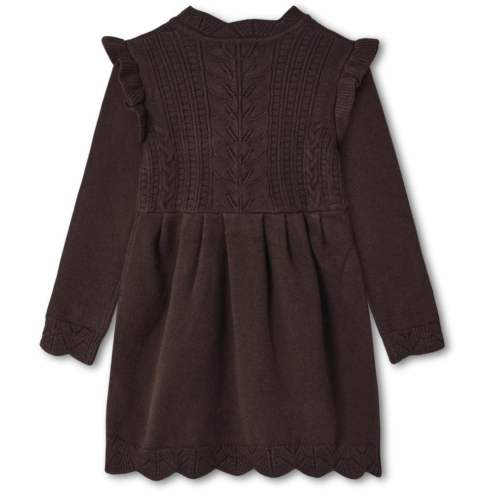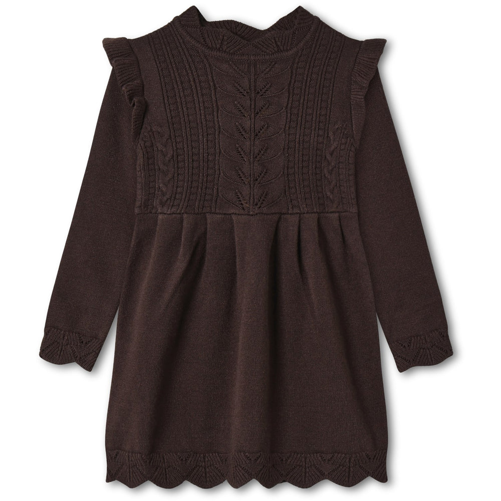 Forkæl din lille én med Fliink Coffee Bean Alilly Kjolen. Denne strikkede kjole er fremstillet i en blød og behagelig kvalitet, ideel til børns følsomme hud. Den har langærmede design med bølget krave og charmerende mønstrede detaljer ved ærmeåbningerne samt kjolens bund. Med en smart taljeudskæring og læg, tilføjes et strejf af volumen for en feminin silhuet. Kjolen kombinerer både komfort og stil, og er lavet af 50% LENZING™ ECOVERO™ viskose, 27% nylon, og 23% polyester, sikrende en mindre miljøpåvirkning. Velegnet til maskinvask ved 30°C på skånsom cyklus.