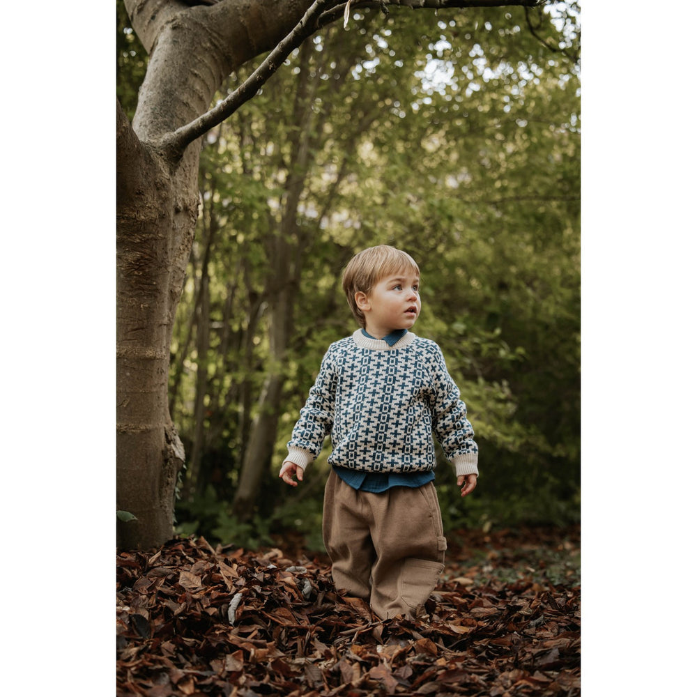 Denne langærmede Fliink Insignia Blue Nova Nordic Pullover er perfekt til dit barns garderobe. Sweateren er fremstillet i en blød blanding af 85% økologisk bomuld og 15% uld, hvilket sikrer både komfort og holdbarhed. Det klassiske nordiske mønster tilføjer en tidløs stil, mens den løse pasform og ribstrik ved halsen, ærmerne og bunden tilbyder optimal bevægelsesfrihed. Nem at vedligeholde, denne pullover kan maskinvaskes og skal blot lægges fladt til tørre.