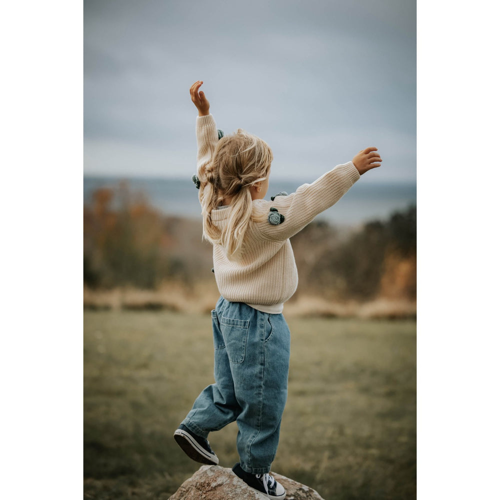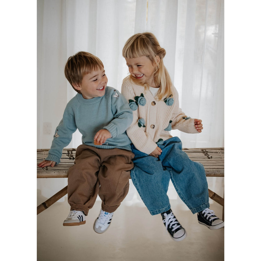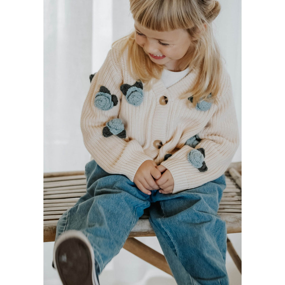 Denne charmerende Cardigan fra Fliink Sandshell er fremstillet i 100% bomuld, hvilket sikrer en blød og behagelig oplevelse for dit barn. Med sit patenterede strikmønster tilbyder denne tykke cardigan en varm komfort. Designet inkluderer en klassisk V-udskæring og praktiske knapper langs fronten. Et særpræg er de håndlavede strikkede roser i levende blå farver med grønne blade, som tilføjer et unikt touch. Vejledningen for pleje omfatter håndvask og undgåelse af tørretumbling for at bevare kvaliteten.