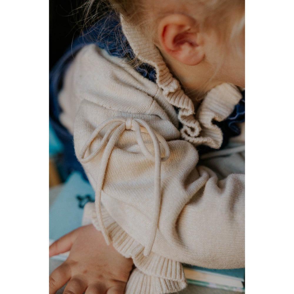 Giv dit barn mulighed for at skille sig ud med denne charmerende og behagelige strikbluse fra Fliink Sandshell. Blusens rundstrikkede bærestykke prydes af delikate flæser omkring hals, ærmer og bund, hver især tilføjer et strejf af elegance og femininitet. De praktiske bindebånd på skuldrene tilføjer et unikt og sødt element til designet, mens den løse pasform sikrer komfort hele dagen, både ved leg og ved festlige anledninger. Fremstillet af en blanding af viskose, nylon og polyester, kombinerer denne bluse holdbarhed med blød komfort. Let at pleje for, kan den maskinvaskes på skånsom cyklus og tørres fladt for at bevare form og kvalitet.