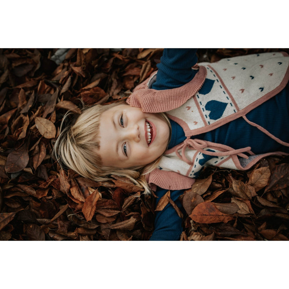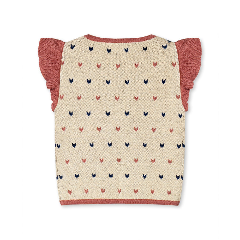 Denne charmerende strikkede vest fra Fliink Sandshell Nova er fremstillet af 85% økologisk bomuld og 15% uld, hvilket sikrer både komfort og holdbarhed. Vesten skinner med et jacquardmønster af søde hjerter og er udstyret med bånd, der kan bindes til dekorative sløjfer, for et personlig touch. Med flæser på skuldrene og en stilfuld kontrastkant langs fronten, halsen og bunden, tilbyder den et moderne stykke, der er både funktionelt og yndigt. Velegnet til maskinvask og designet til at tørre fladt, forener denne vest hverdagspraktik med fin æstetik.