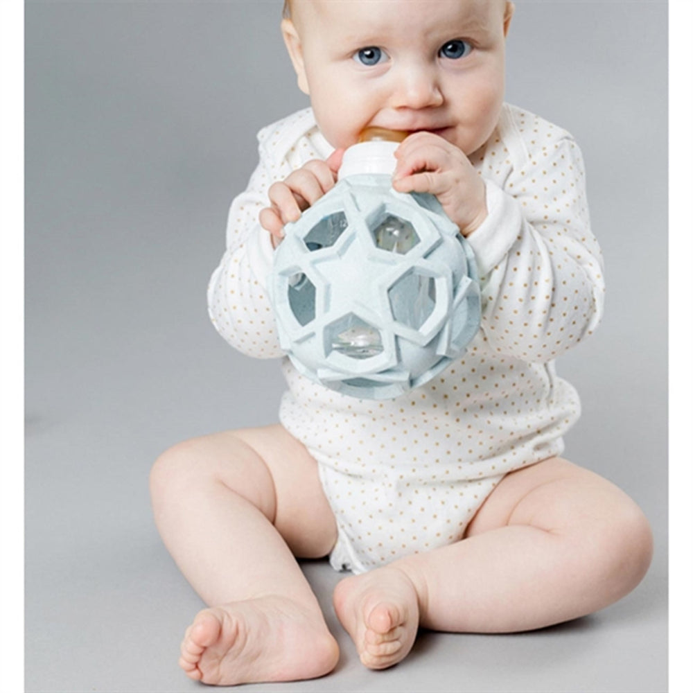 2-i-1 sutteflaske med stjernebold cover i blå.Bolden, som sættes på flasken, beskytter mod brud, hvis barnet eller du taber flasken. Desuden gør den det nemmere og sjovere for det lille barn, at hjælpe med at holde i flasken. Flasken kommer også med en 100% naturgummi-sut (størrelse 0-3 måneder til mælk og vand) og lækagesikkert støvdæksel. Yderligere gummisutter med langsom flow og medium flow kan også tilkøbes.
