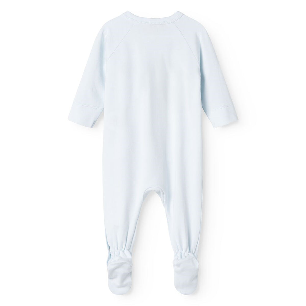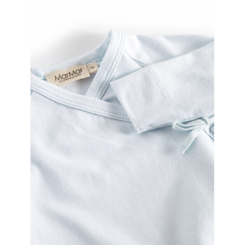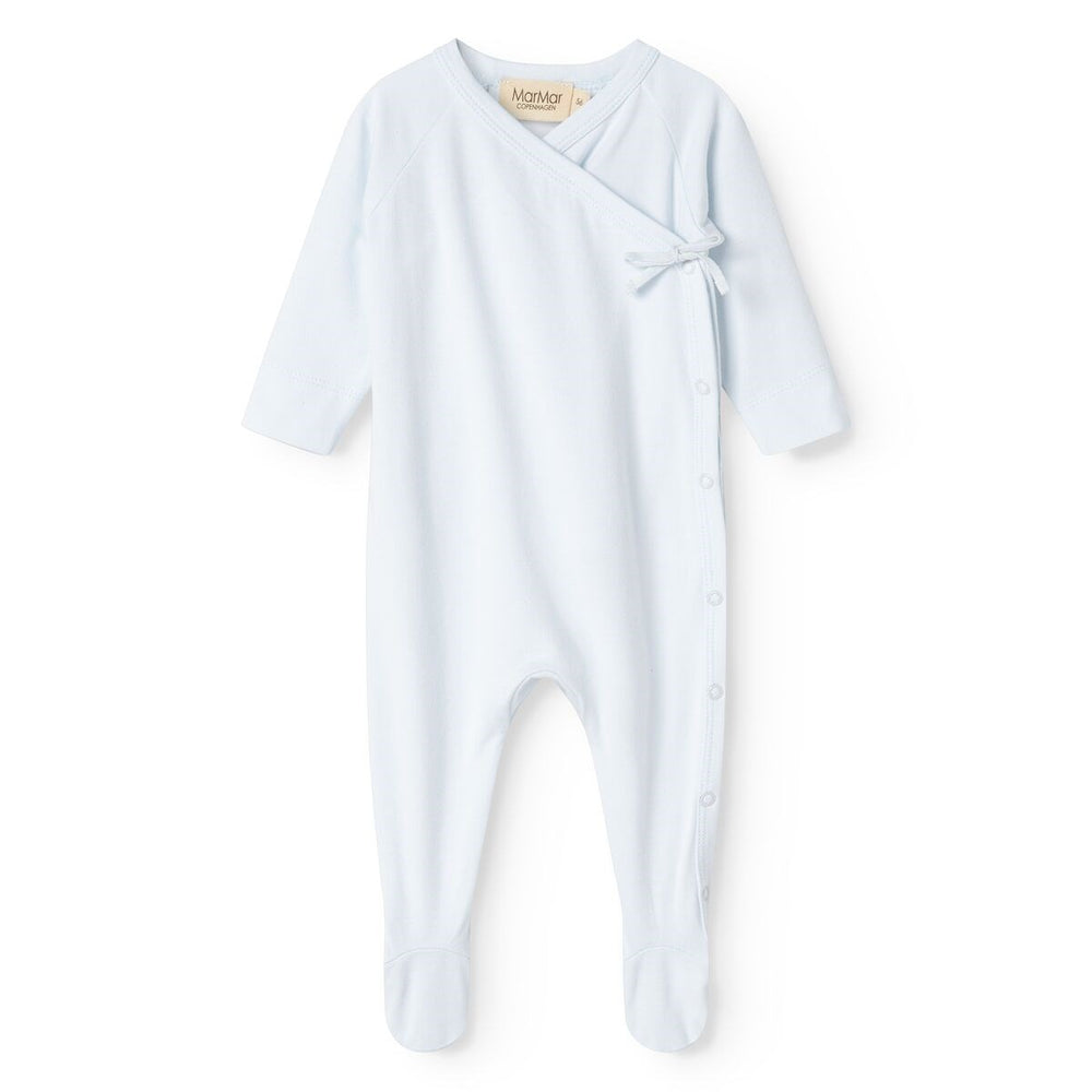 Denne langærmede MarMar Rubetta heldragt i lyseblå er designet til nyfødte. Omslagsfunktionen samt trykknapper fra halsen ned langs benet gør det nemt at skifte dit barn. Heldragten kombinerer stil med funktionalitet, sikrer komfort og er ideel til både legetid og hviletid.