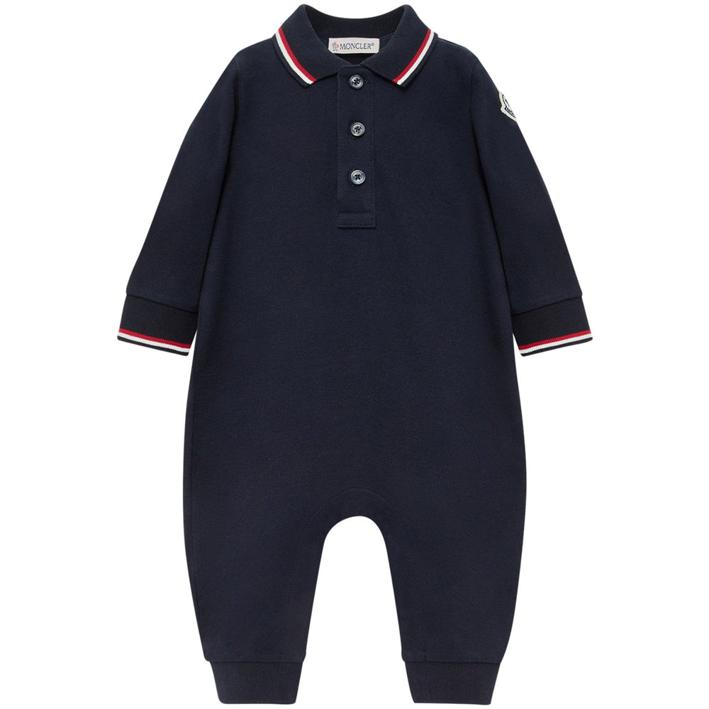 Vælg denne skønne Moncler navy-romper til din lille én. Fremstillet i blød bomuldspiké sikrer den ultimativ komfort og bevægelighed. Designet er inspireret af polo-stilen, komplet med en charmende trefarvet kant, der tilføjer et stilfuldt præg. Perfekt til hverdagsbrug og speciallejligheder, hvor komfort møder klassisk elegance.